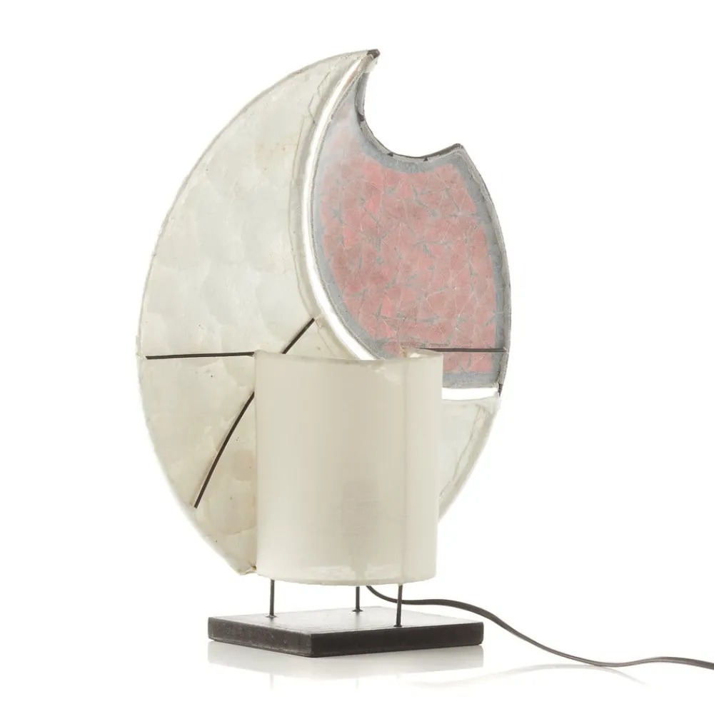 Dekoreret YOKO bordlampe med mosaik YOKO bordlampen er et harmonisk blikfang i perlemorsfarvede og røde toner. Dens ovale skærm er dekoreret med Capis-skiver (perleskaller), glasmosaik og en tynd kontur af spejlglas. Et blødt, indirekte lys spotlightes gennem den, så intet står i vejen for en hyggelig atmosfære.
