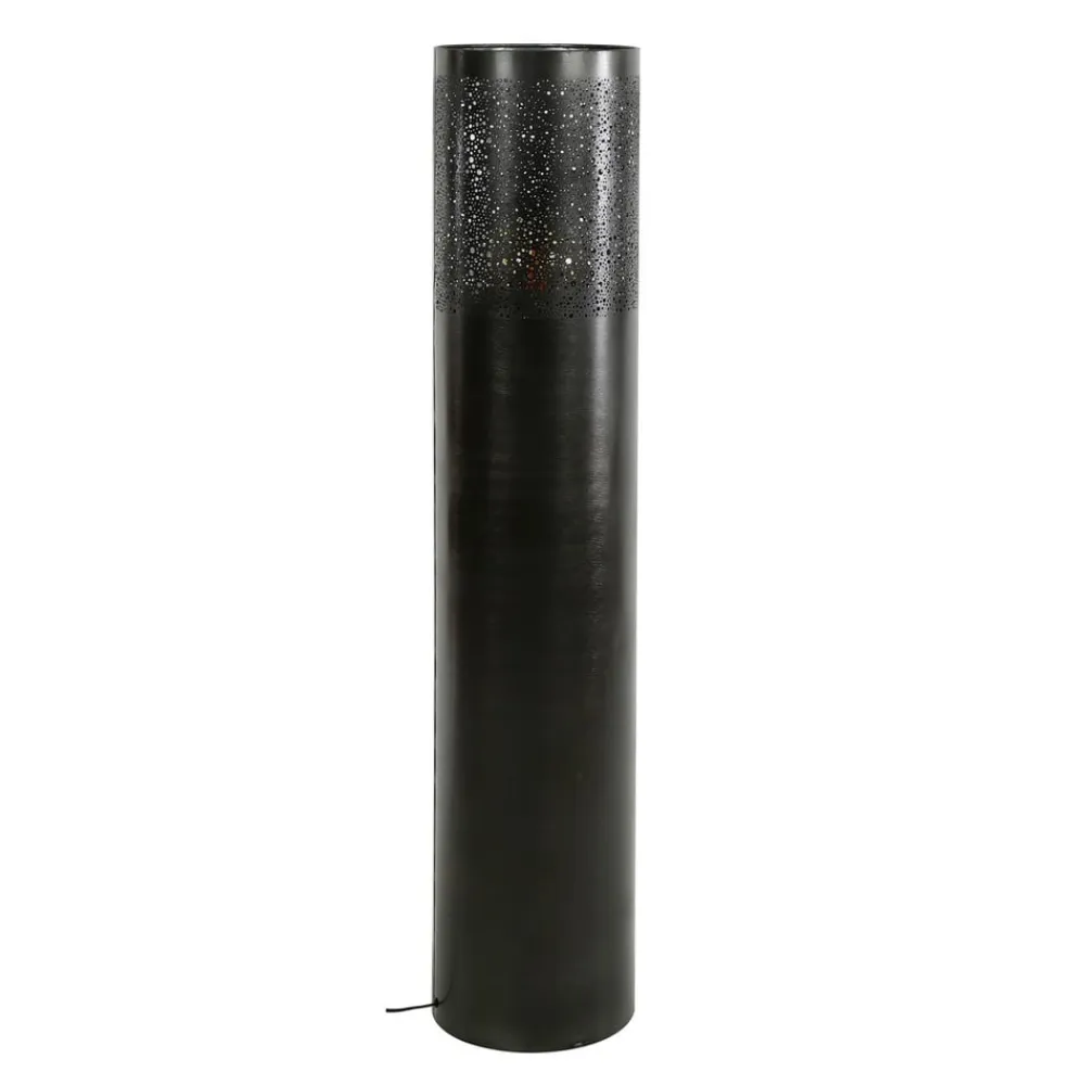 Narabi gulvlampe i cylindrisk form Narabi metalgulvlampe er cylindrisk i formen og har en flot sort-nikkel-finish. Der er stanset diskrete huller i metallet i den øverste tredjedel, så lyset kan slippe ud og skabe en hyggelig atmosfære.