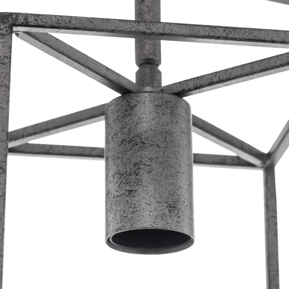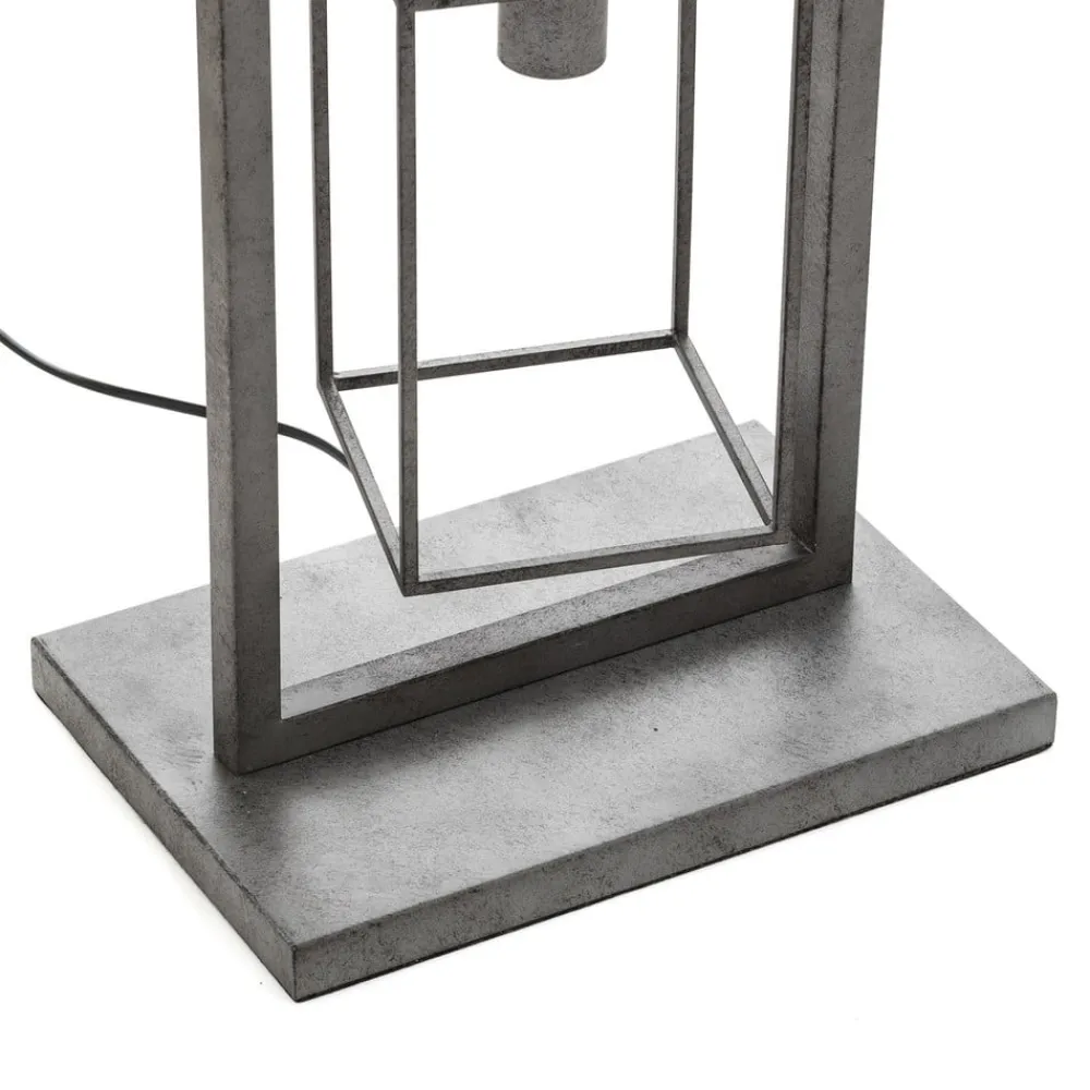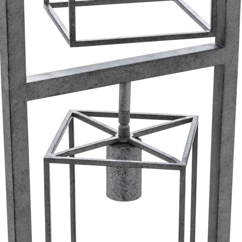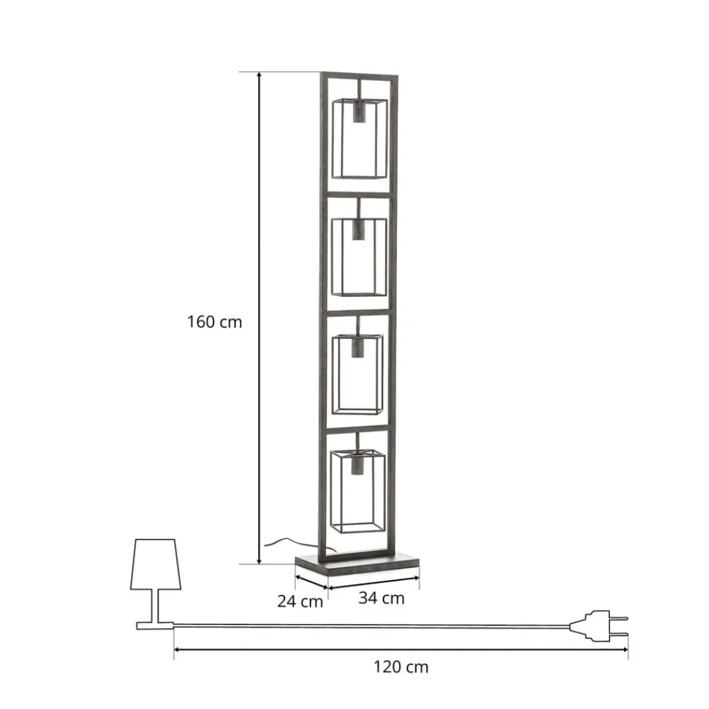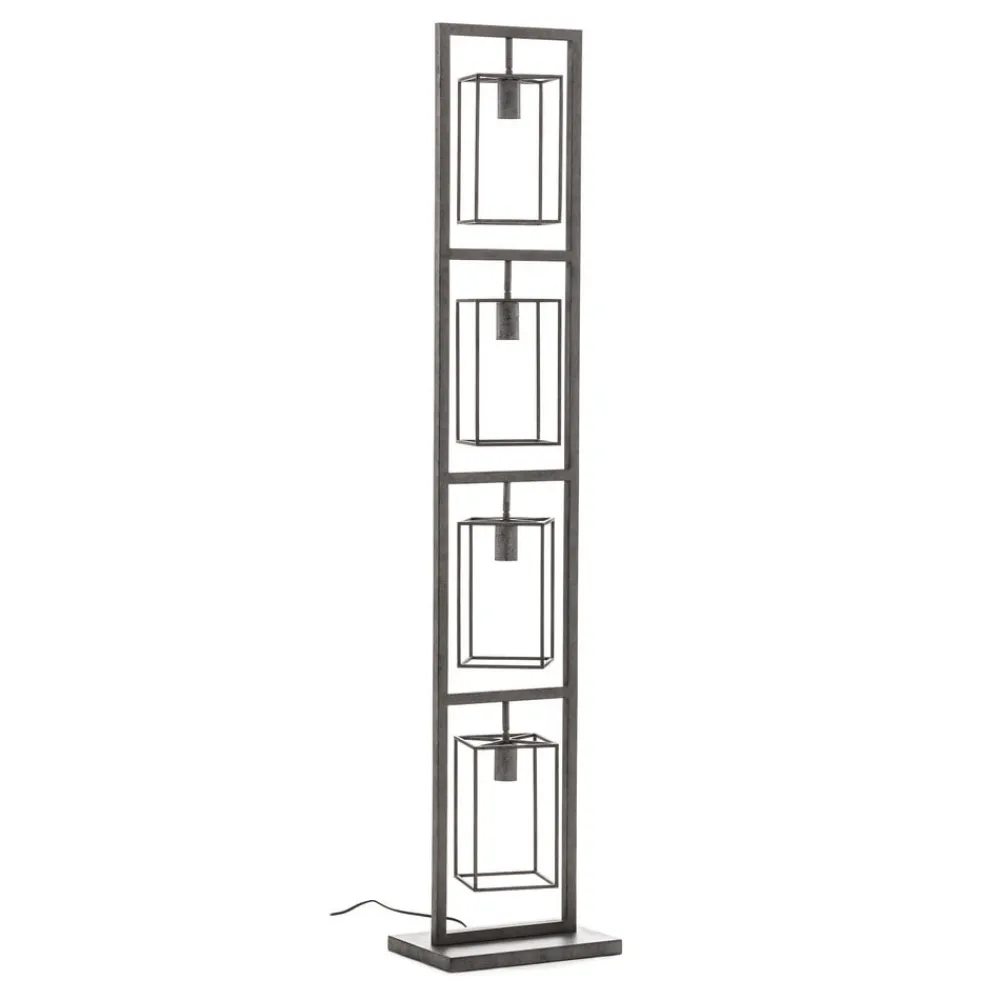 Perpendillu gulvlampe med fire lamper – rektangulær og åbenPerpendillu gulvlampe af metal er en iøjnefaldende og stemningsfuld lyskilde til hyggelige interiører. Rammen er en høj rektangulær ramme med en bund, som er opdelt i fire sektioner af vandrette stivere. I hver sektion hænger en skygge i form af en åben terning, der kan drejes. I alt fire dekorative E27-lamper kan udfolde deres fulde effekt i Perpendillu og fremhæve den antikke patinerede sølvfinish. Gulvlampen betjenes med en afbryder, der er integreret i kablet.