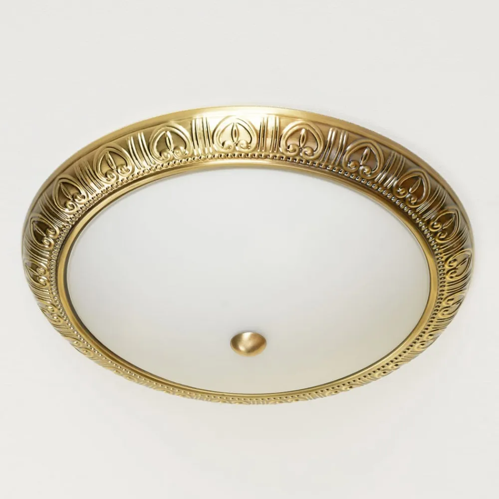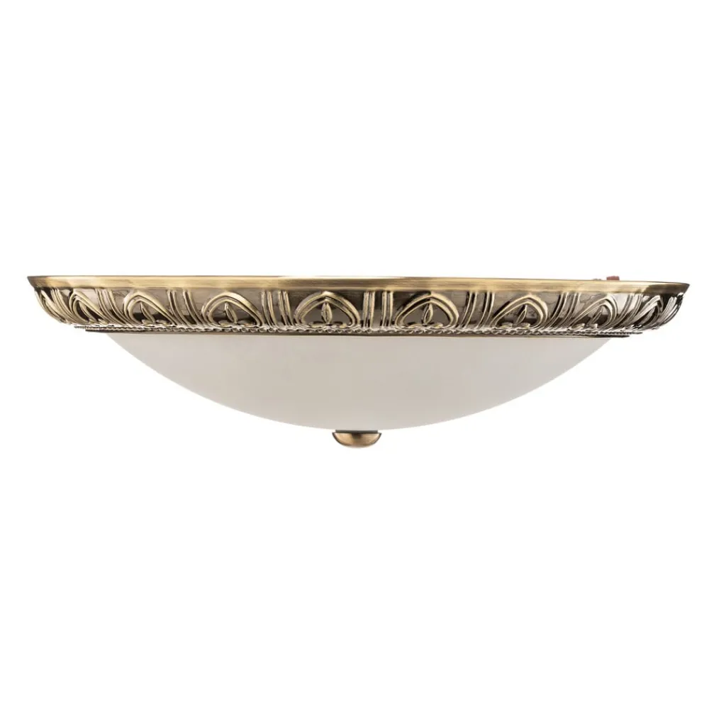 Lembit loftlampe, rund, 38 cm i diameter Loftlampen fra Lembit-serien er rund og har en diameter på 38 cm. Der er brugt materialer af høj kvalitet og fremragende håndværk til denne lampe. Det hvide opalglas er sat i en udsmykket antik messing fatning. Tre 40 watt-lamper giver tilstrækkelig lysliste.