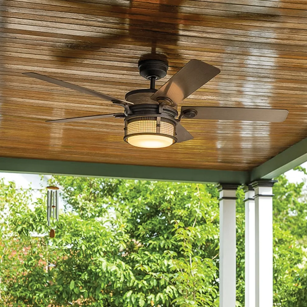 LED-loftventilator Ahrendale med fem blade – med beskyttelsesklasse IP44 også egnet til udendørs brug