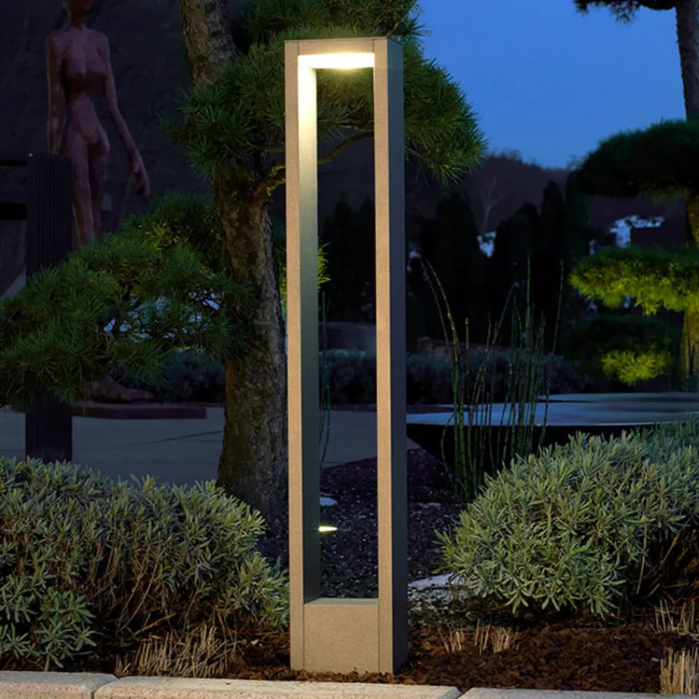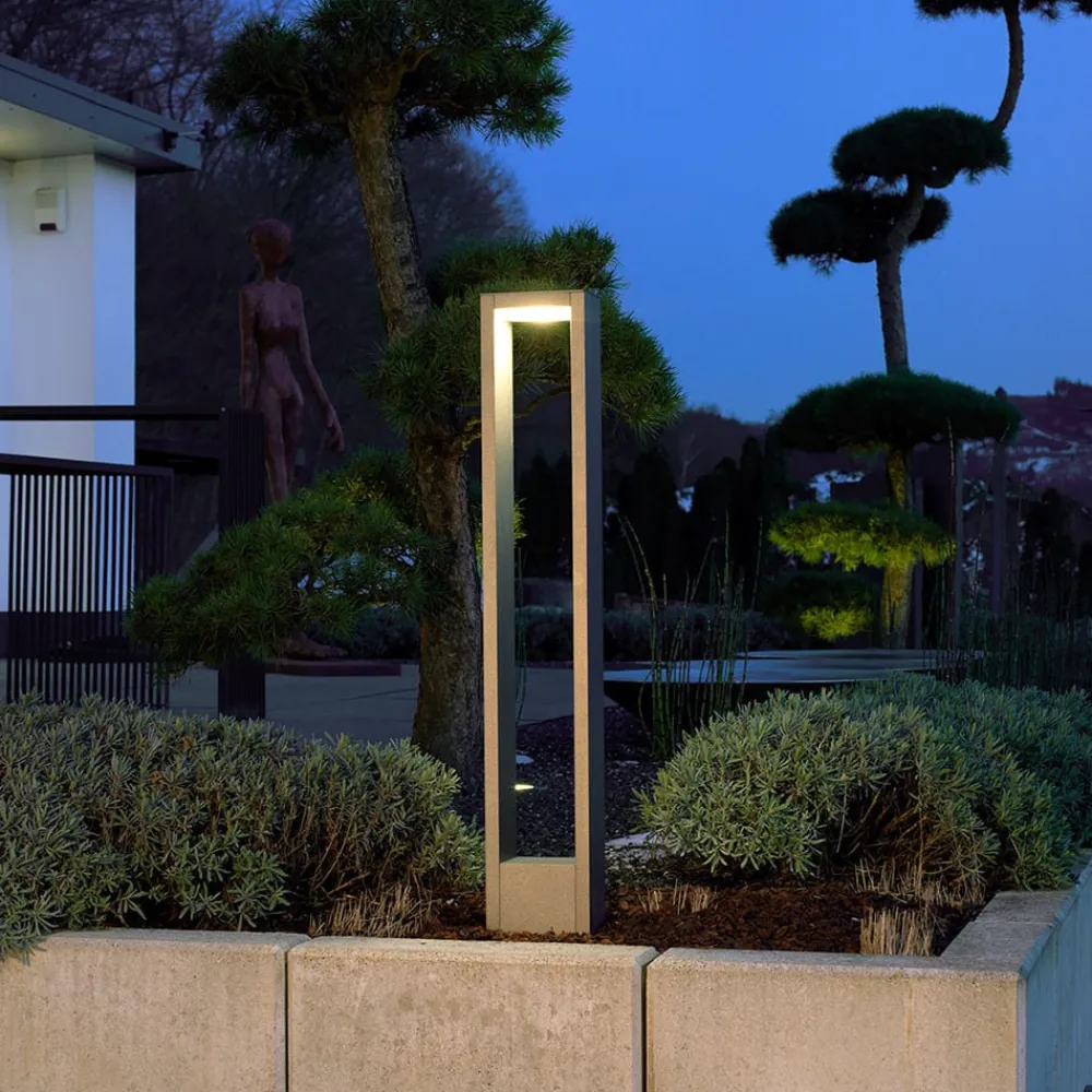 Adriana LED-gadelampe i diskret antracit Den dæmpbare Adriana-gadelampe sikrer, at den sti, den oplyser, altid er optimalt oplyst. Dens klare design gør den til en tidløs pære, der bringer stil til haven. Rammelyset i form af en langstrakt kube udsender et varmhvidt lys mod jorden. Lampens rektangulære form og klare kanter skaber en særlig minimalistisk effekt. Vejlampen har form som en aflang, rektangulær ramme med et hulrum mellem sidestøtterne, hvor pæren spotlightes ind. Lampens base er ret høj, mens siderne er meget smalle. Under toppen, der ligesom resten af lampekroppen er lavet af støbt aluminium, sidder den smalle LED-pære, som er indkapslet i opalfarvet akryl.