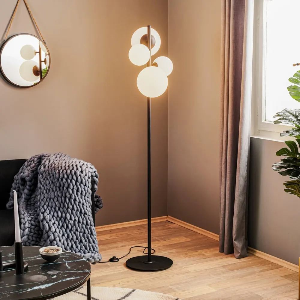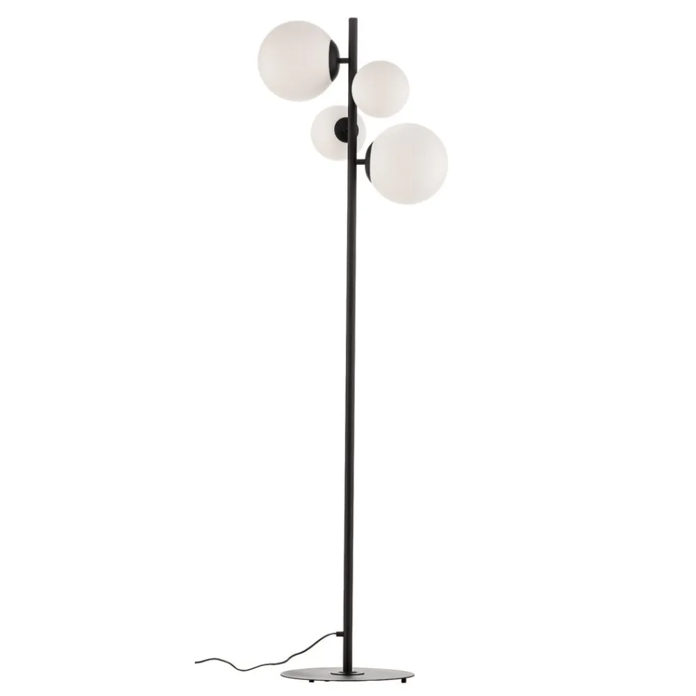 Gulvlampen Dione, 4 lyskilder, sort, forener moderne design med funktionel als. Fremstillet af højkvalitets metal og glas, passer denne lampe perfekt ind i forskellige rum som stuen, soveværelset og spisestuen. Kombinationen af sort og hvidt frostet glas giver lampen en tidløs elegance, der fungerer både som dekorativt element og som funktionel lyskilde.