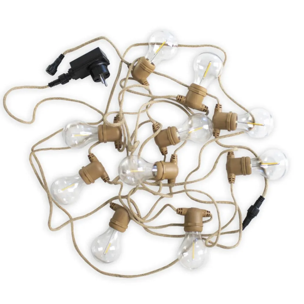 Allegra LED-lyskæder med jutekabel og stik Det brune jutekabel giver Allegra LED-lyskæderne et smukt, naturligt præg på indendørs og udendørs områder. Med en IP44-beskyttelsesgrad kan den f.eks. bruges på altanen, terrassen, i haven eller i stuen eller soveværelset. De 10 dekorative pærer i filament-look udsender et behageligt varmt lys til omgivelserne og kan udskiftes. I alt fire lyskæder kan kobles sammen.