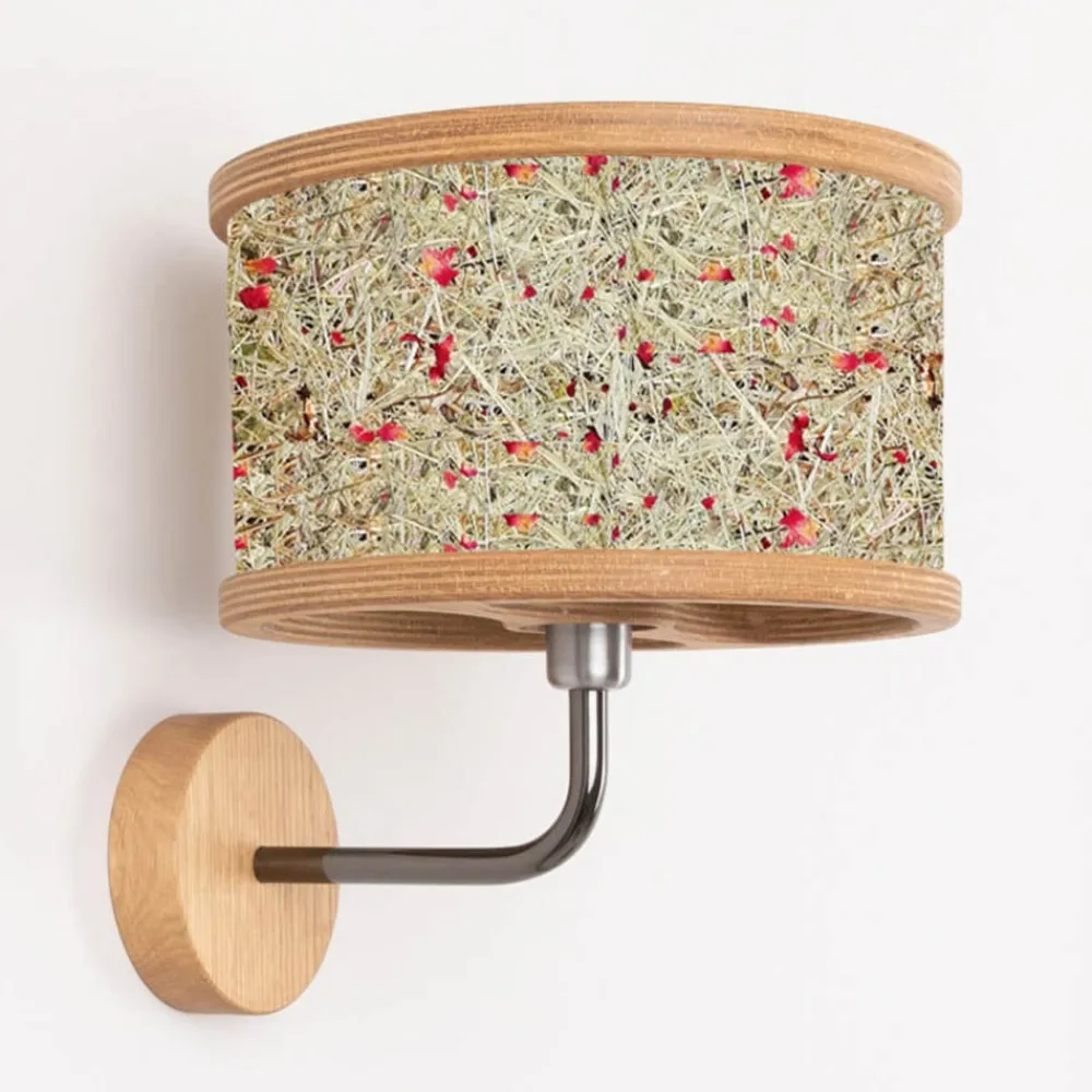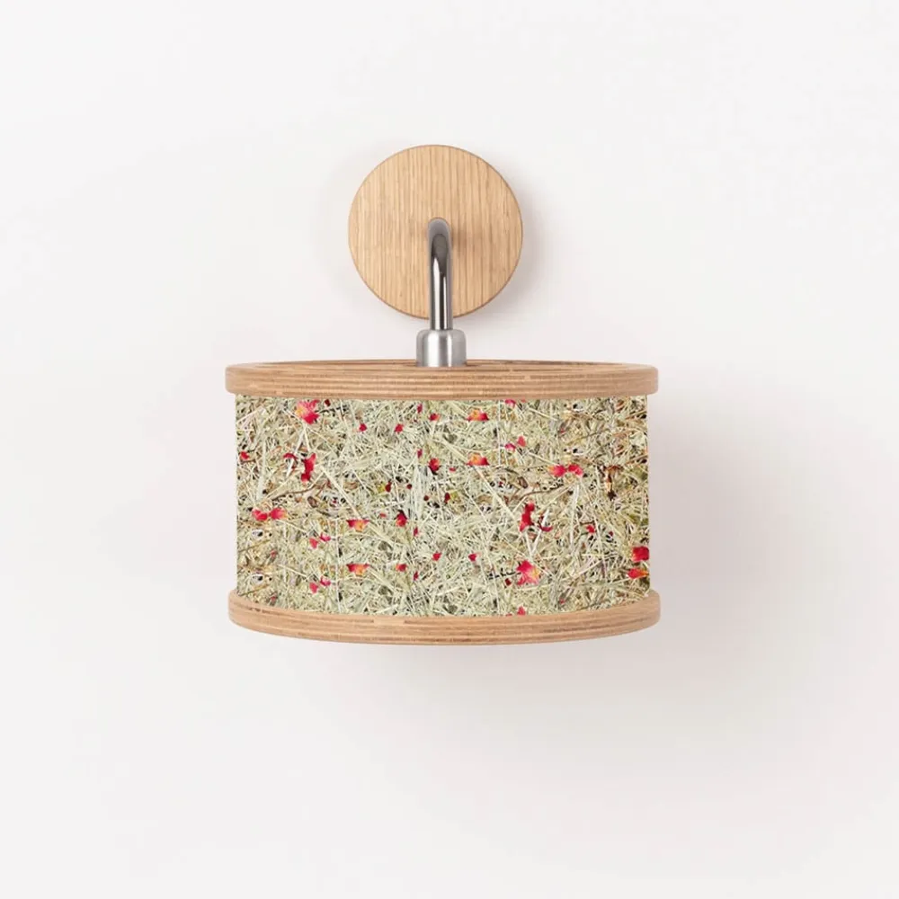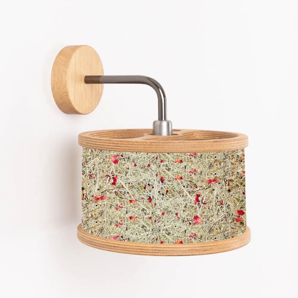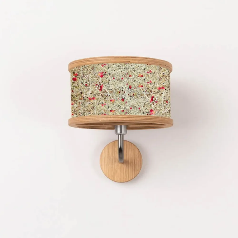 Væglampen fra designserien 2610 overbeviser med sin naturlige stil og bringer flair fra de tyrolske bjerge ind i stuen. Skærmen er lavet af ægte tyrolsk bjerghø, mens rammen og den runde baldakin er lavet af egetræ. En metalarm, der hælder opad, støtter skærmen.