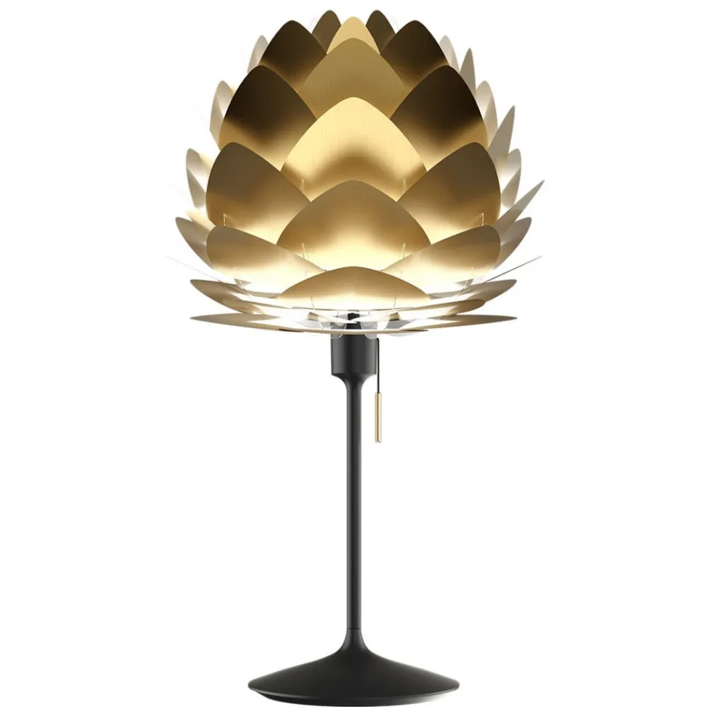 Aluvia mini er en dekorativ lyskilde og et indretningsobjekt til den moderne bolig og lounge. Skærmen fremhæves perfekt af det diskrete sorte bordstativ. Med mange overlappende aluminiumselementer i børstet messinglook følger den formen af en eksotisk blomst. En USB-port i bunden af stativet kan bruges til at oplade f.eks. en smartphone.