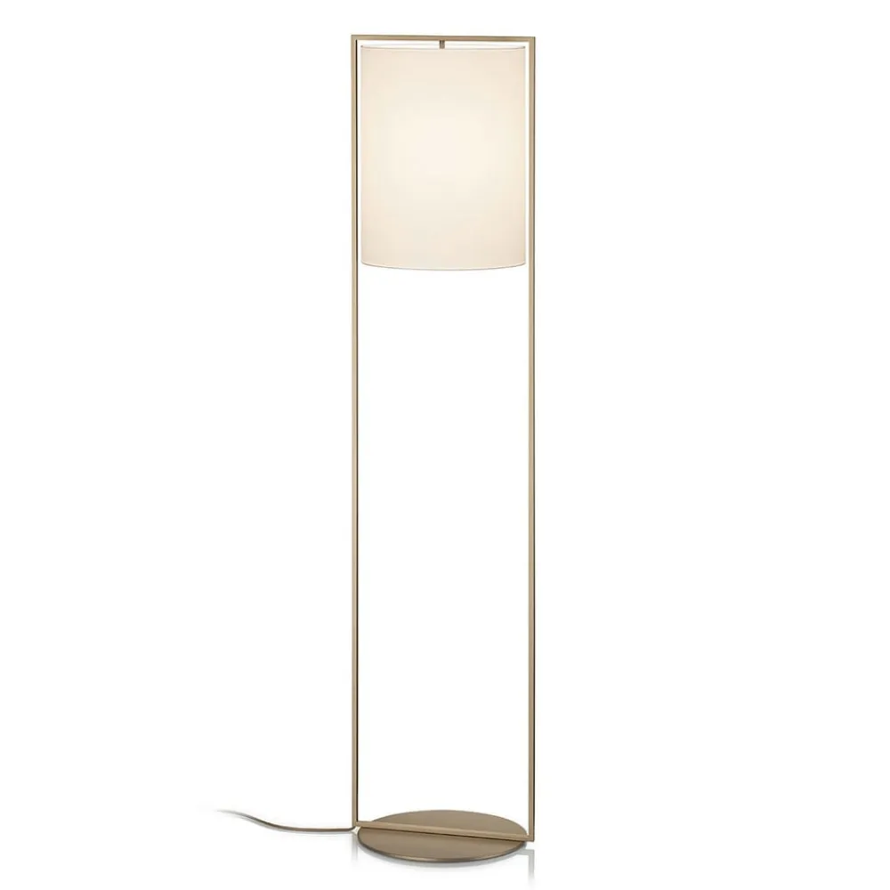 En cylindrisk lampeskærm af hvid chintz og en flad, rund fod af metal, forbundet af en enkel ramme i bronze-look: det er den moderne Alva gulvlampe. Det minimalistiske indretningsobjekt er ideelt som atmosfærisk ekstra belysning i moderne boligområder.