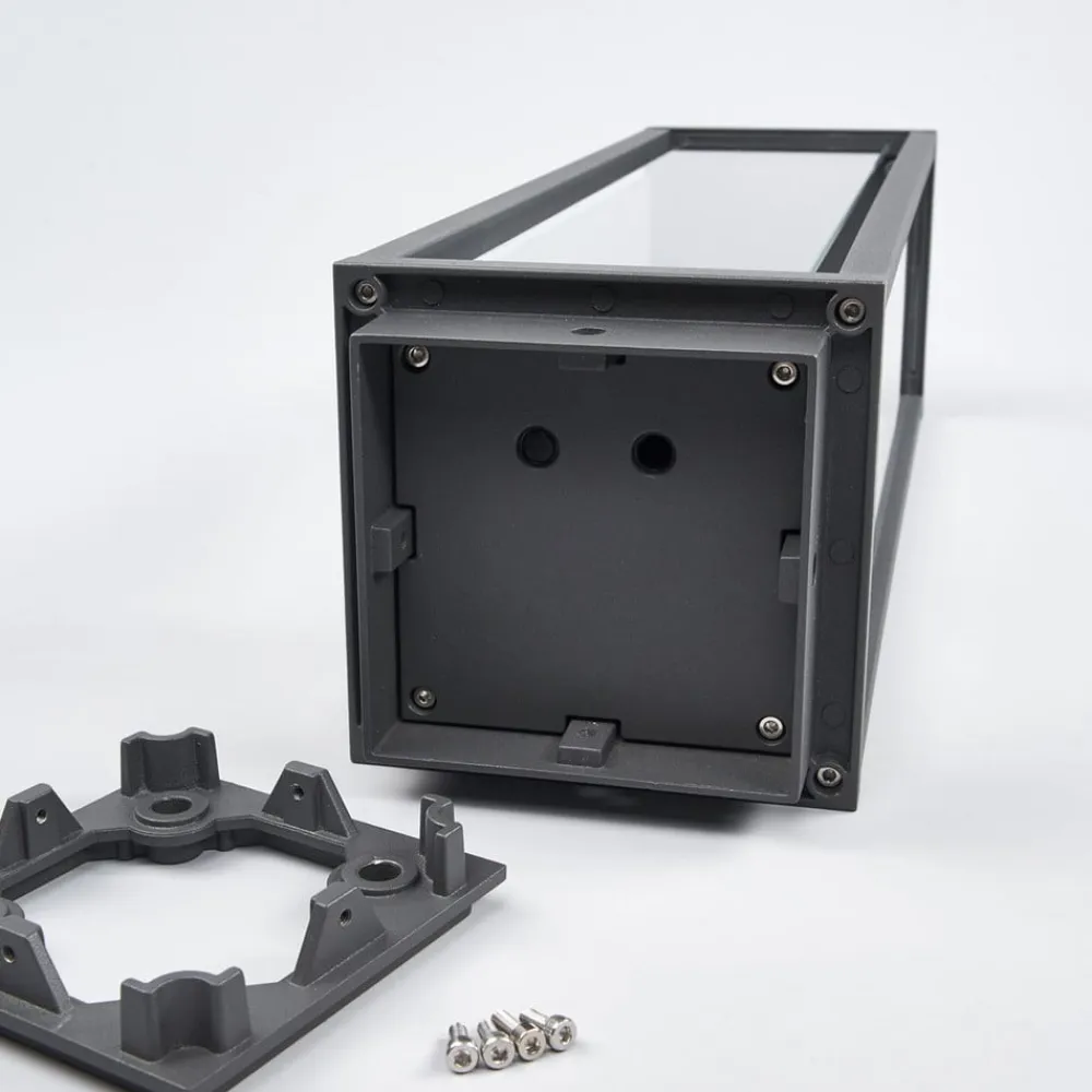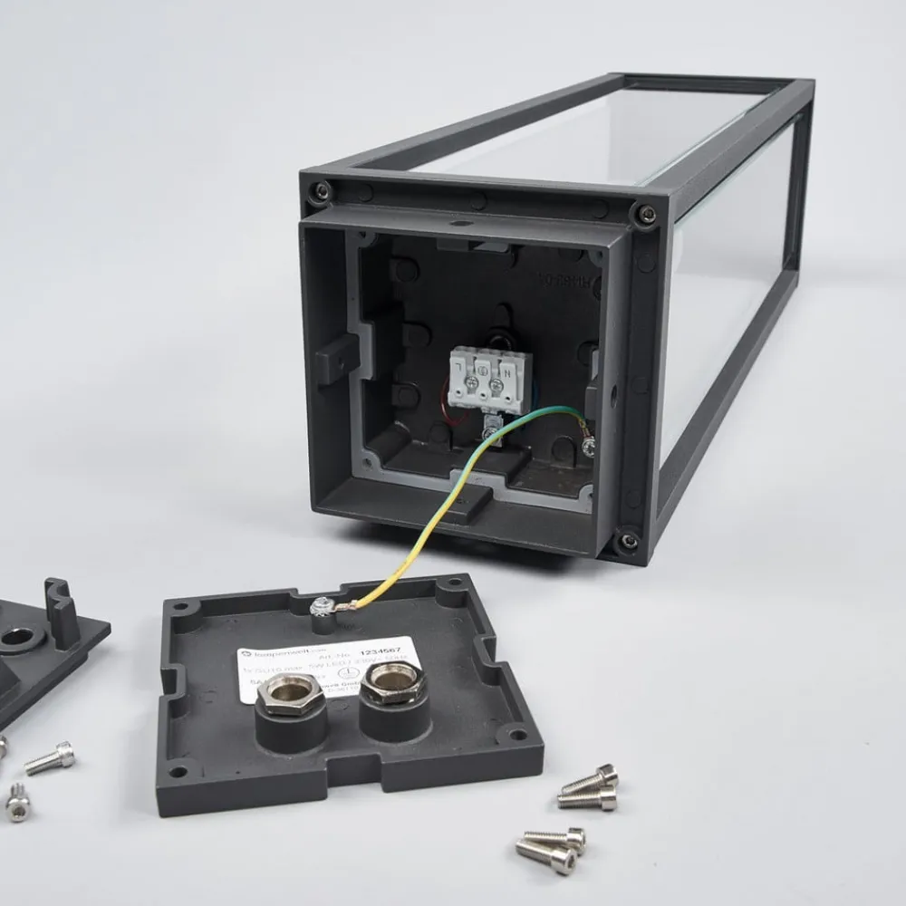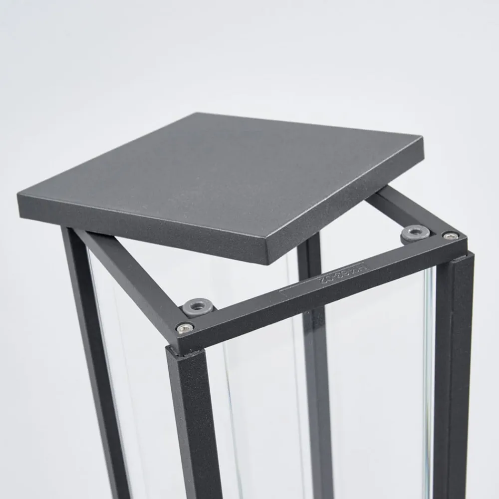 Kantet Annalea sokkellampe med glasindsatser Den mørkegrå aluminiumsramme har en kantet form, som giver den et meget moderne udseende. Glasindsatser med en klar overflade supplerer metalelementerne og sikrer et klart udsyn, så intet af lysstyrken i den anvendte lampe går tabt. Sokkellampen kan smukt placeres på en væg eller anden forhøjning, hvor den så får en særlig tilstedeværelse og passer særligt godt ind i moderne arkitektur.