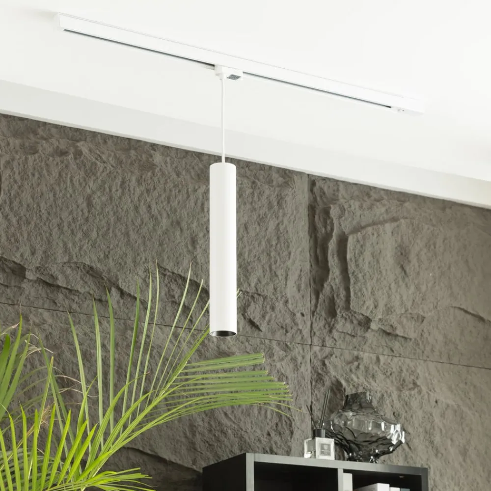 Dæmpbar Ejona 3-fase skinne pendellampe i hvid, lysfarven ændres, når den dæmper Takket være en dæmpbar funktion er denne pendellampe meget velegnet til hyggelig hyggebelysning, uanset om du vælger et privat eller kommercielt miljø. Hvis der bruges en ekstern dæmper, bliver lysfarven varmere, jo mere lysstyrken falder. Takket være adapteren er Ejona designet til brug med en eksisterende eller kommende 3-fase skinne, som kan suppleres med forskellige armaturer for at skabe et helt skræddersyet belysningskoncept. Den hvide overflade på den cylindriske skærm har et enkelt, behageligt og tidløst udseende og kan integreres på mange forskellige måder.