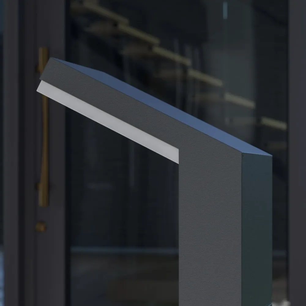 Grafitgrå LED pullert Yolena med integreret bevægelsessensor Yolena har et moderne look, fordi alt omkring vejlampen er særligt enkelt. Aluminiumskroppen har en grafitgrå finish, og de lyse, energibesparende LED’er er placeret i den øverste del, som har en skrå form. De lyser derfor hovedsageligt nedad og giver et godt orienteringslys til gårdspladser og indkørsler. De, der kun vil have lyset til at tænde, når der er brug for det, vil være glade for den integrerede bevægelsessensor. Den reagerer på bevægelser i en vinkel på 150° og inden for en maksimal rækkevidde på 12 meter. Lysets varighed kan justeres og kan indstilles mellem 5 sekunder og 8 minutter.