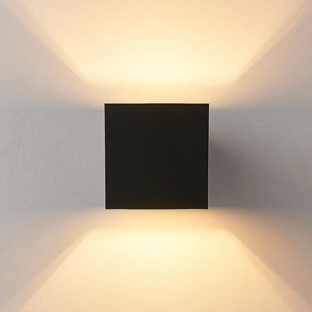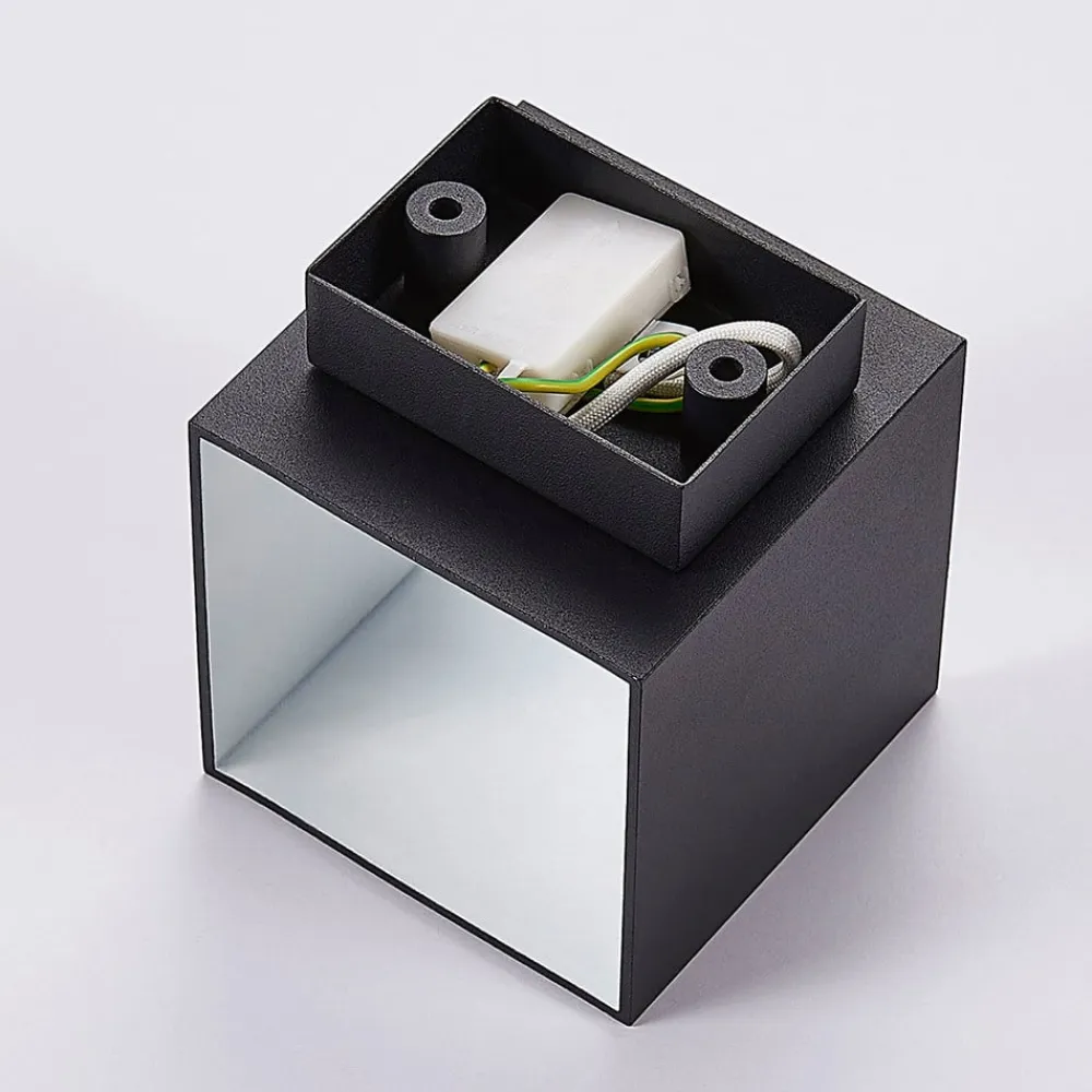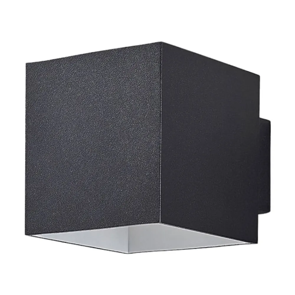 Sort Zuzana væglampe med effektivt lysudslip opad og nedad Zuzana har en kompakt terningeform og er en lyskilde af aluminium med sort finish. Indersiden af lampen er udstyret med en G9-lampe, hvis lys kan slippe ud opad og nedad og skabe en effektiv glød på væggen. Designet har et moderne, men tidløst udtryk og kan nemt integreres i mange miljøer, hvor lampen giver et hyggeligt skær.