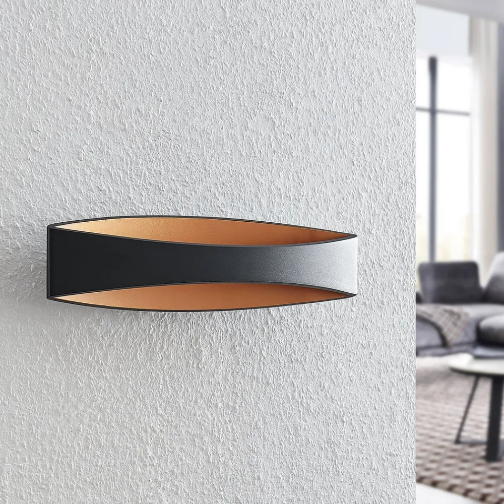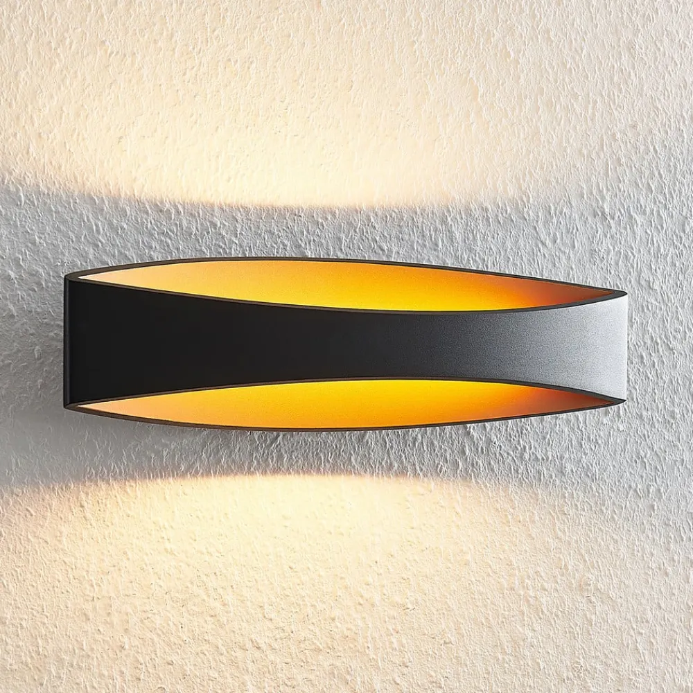 Sort og guld LED-væglampe Jelle med en interessant form Denne væglampe passer meget godt ind i moderne interiører med sit afrundede design, som er en kombination af konvekse og konkave former. Frontpanelet har en konveks form, mens det bageste element har en konkav form, så det forbliver tydeligt synligt og visuelt skaber en kombination af sort og guldindretning. Denne farvekombination anses for at være meget effektiv og svarer til en harmonisk kontrast, som har været meget på mode i nogen tid nu. Designet muliggør også en helt blændfri belysning, og LED’erne spotlighter smukt den gyldne overflade, som derefter reflekterer lyset på en varm og hyggelig måde. Sidst, men ikke mindst, skal det nævnes, at LED-teknologien er langtidsholdbar og også scorer med førsteklasses effektivitet, hvilket betyder, at stærkt lys kombineres med lavt strømforbrug. En væglampe af denne type passer perfekt i alle slags opholdsrum, men især godt i passager som korridorer eller klassisk i et soveværelse eller en stilfuld stue.