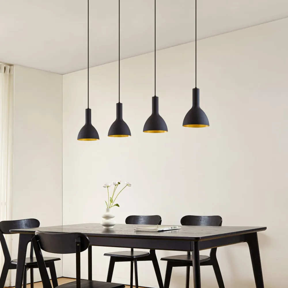 Hængelampe til spisestuen med 4 lyskilder, Cosmina, med metalskærme i sort og guld