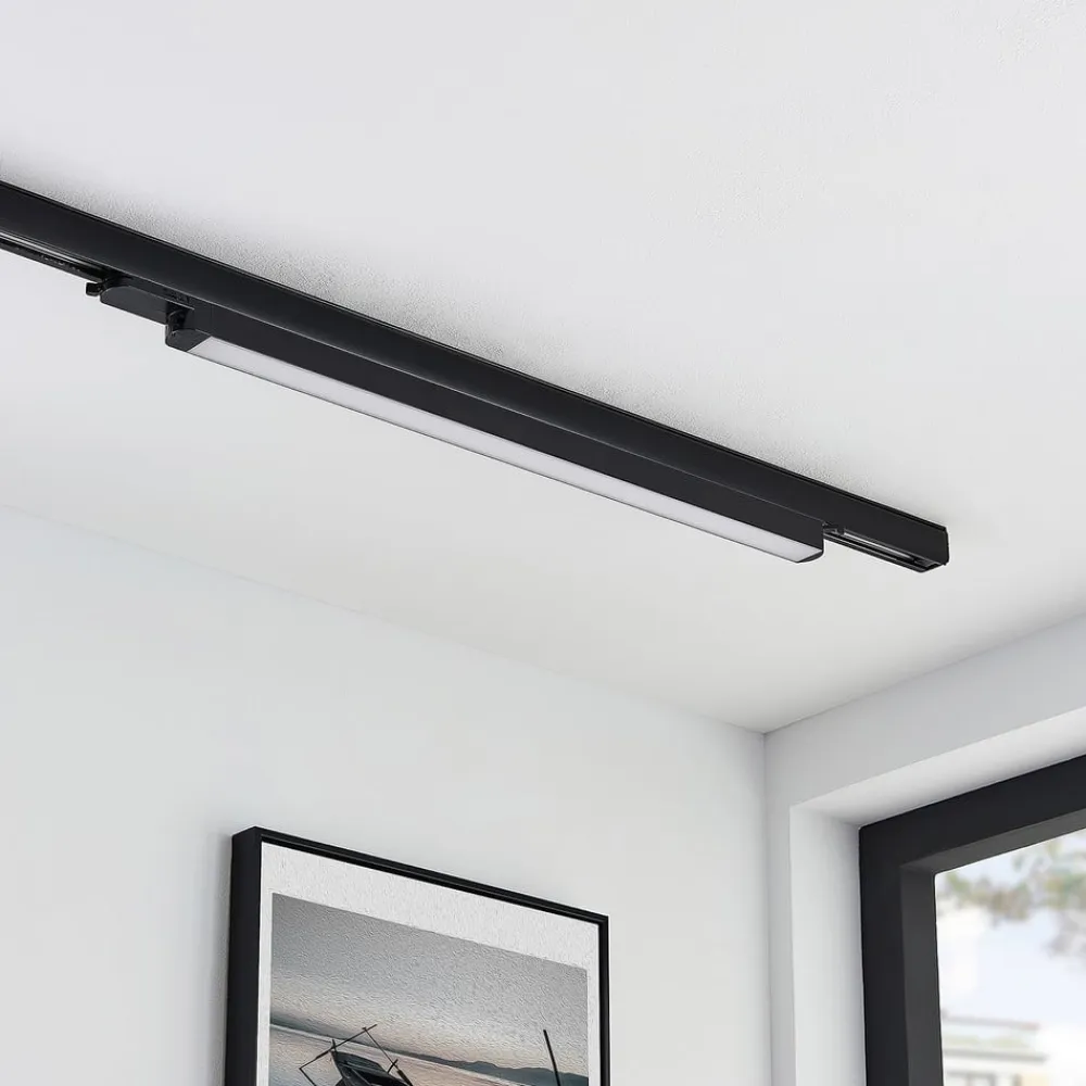 Sort Harlow LED lineært armatur til montering på et skinnesystem Harlow er en lyskilde, der giver god belysning med sin aflange form. Takket være LED-teknologien kan man sikre en god lysstyrke med et lavt strømforbrug, og LED’erne bag den hvide plastikafskærmning giver en så ensartet belysning som muligt og dermed et behageligt lys. ALS skinnesystemarmatur er Harlow en lyskilde, der kan bruges på mange forskellige måder, og som også kan kombineres med alternative lyskilder på 3-fase skinnen. Det er ikke kun rum i private lejligheder og huse, der egner sig til at bruge LED-skinnesystemet, det er også altid en nyttig tilføjelse i kommercielle eller offentlige bygninger, når det drejer sig om at skabe et sofistikeret, tilpasset belysningskoncept. Visuelt holder armaturet på skinnesystemet sig diskret i baggrunden og scorer point med en moderne overflade i sort – til brug på 3-fase skinne – SDCM < 4 – UGR 29.3