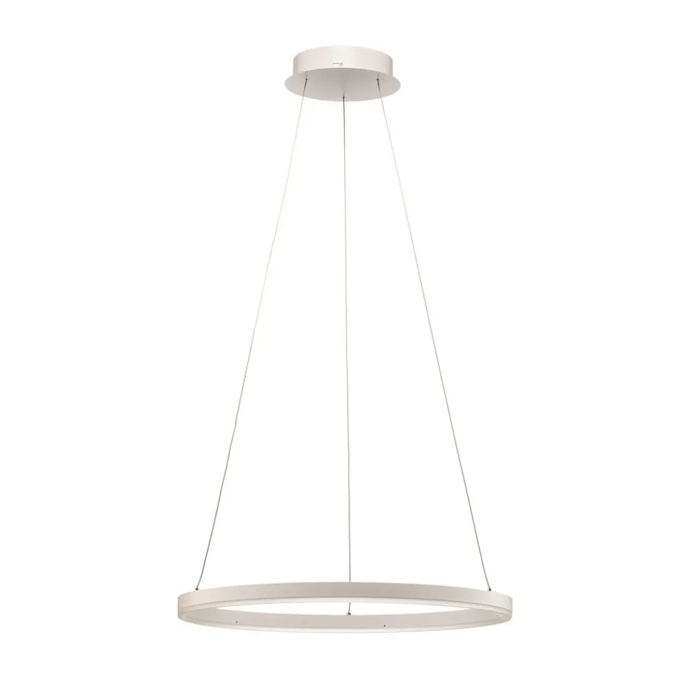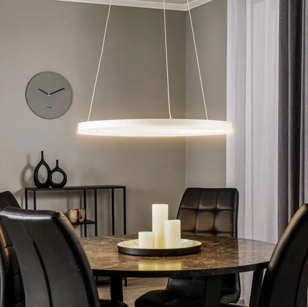 Albiona ringformet LED-pendel i en slank, hvid finish Albiona LED-hængelampen imponerer over hele linjen med sit elegante og minimalistiske design. Den har et lille, rundt loftbeslag af aluminium og tre fine ledninger, som lampeskærmen er fastgjort til i en fejende ringform. Armaturets hvide design trænger sig ikke på visuelt og passer vidunderligt ind i et moderne miljø. De fastmonterede LED’er er lyse og økonomiske på samme tid og giver god belysning – uanset om det er over spisebordet eller køkkenbordet.
