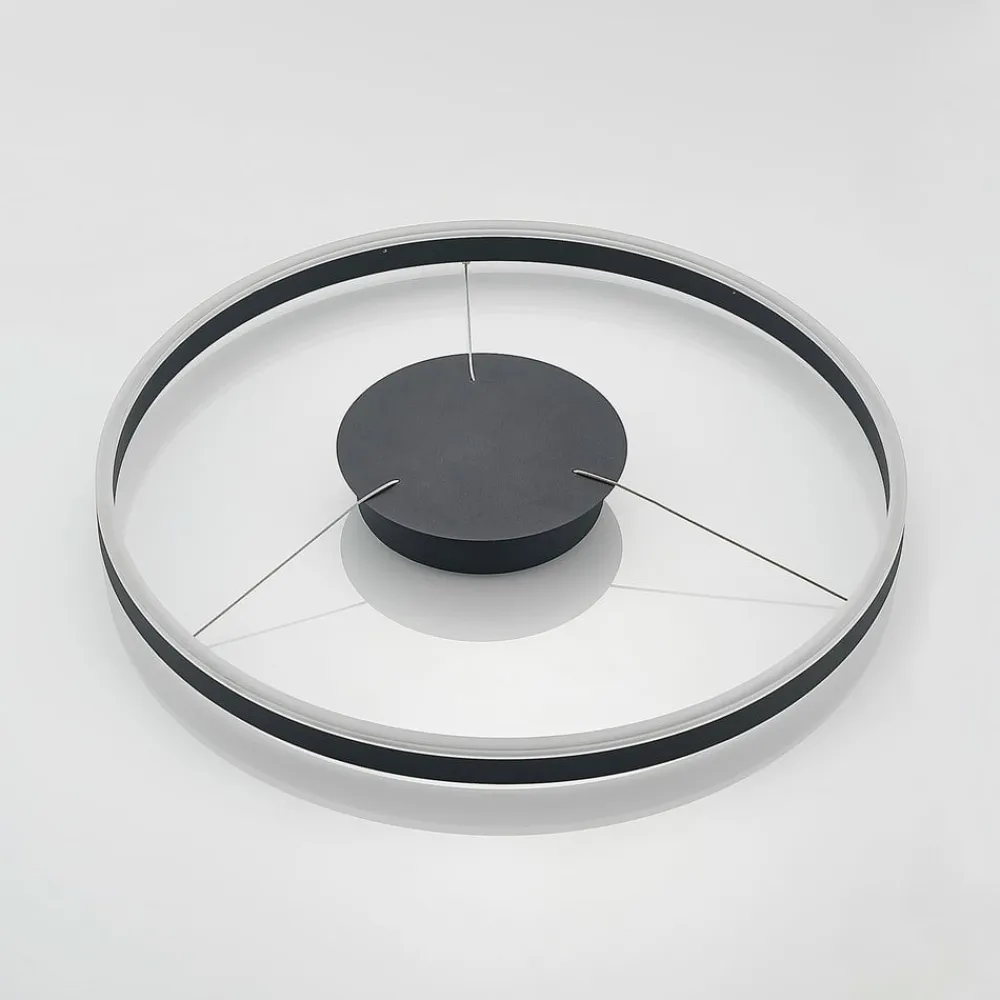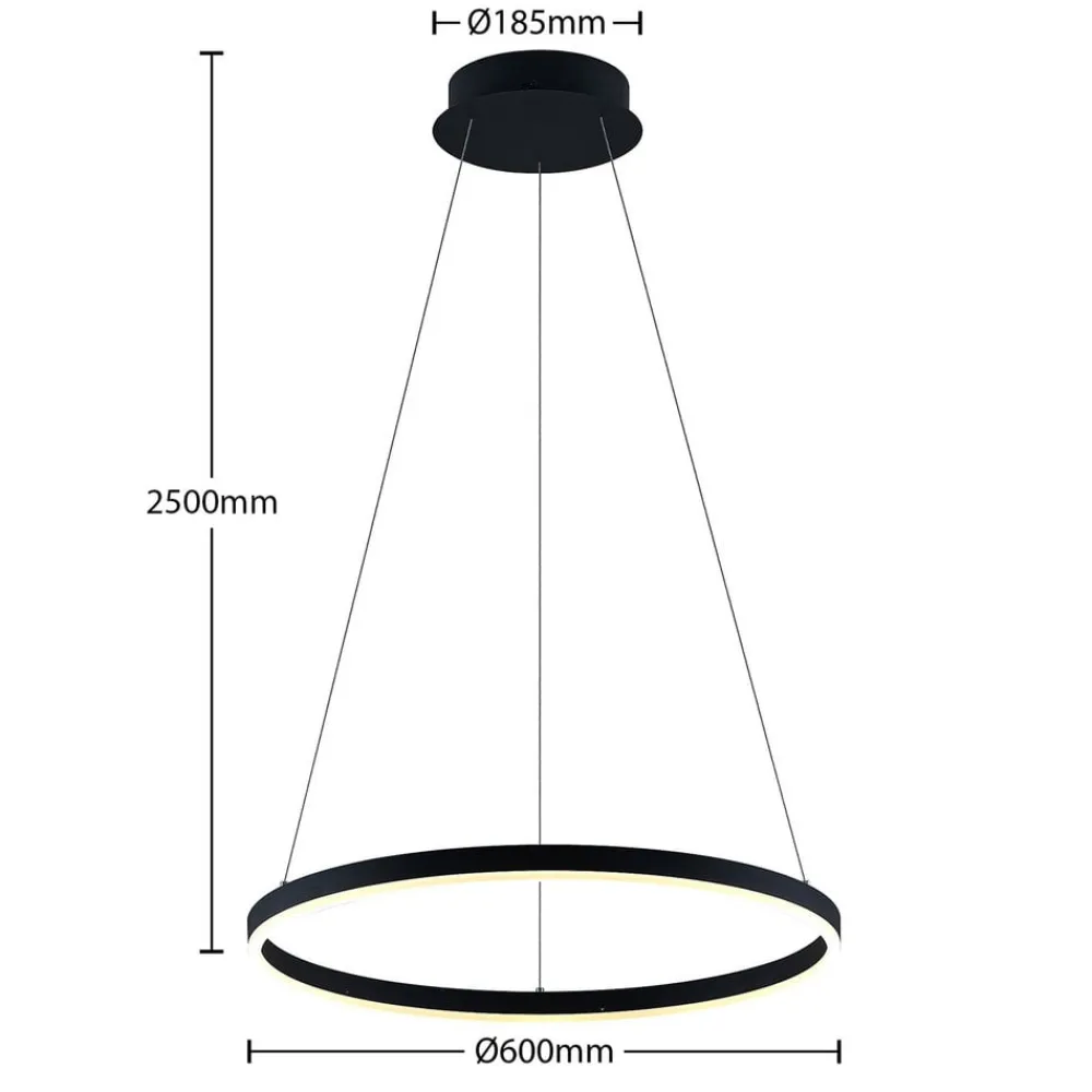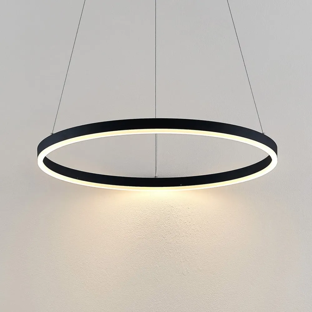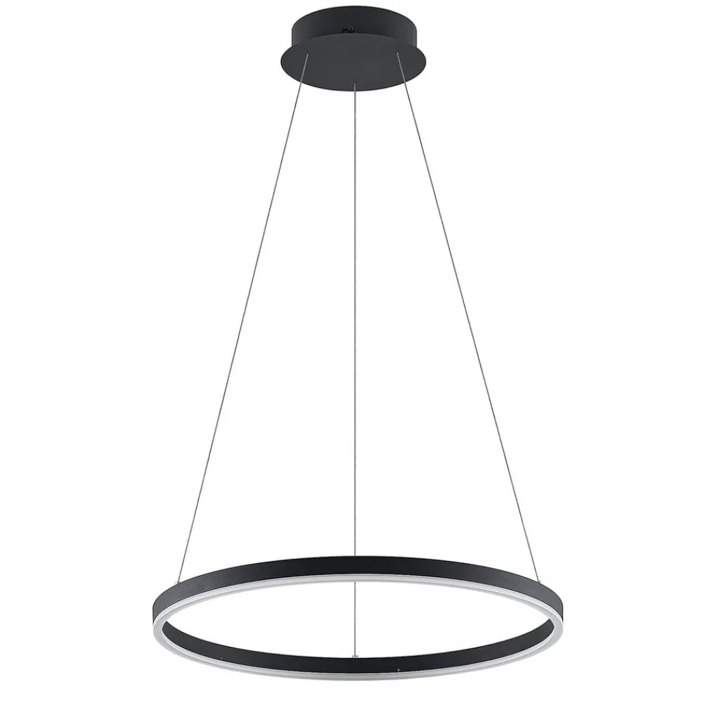 Albiona ringformet LED-pendellampe i sort – perfekt til køkkener og spisestuer Albiona er en lyskilde, der med sin moderne, minimalistiske ringform ser særligt stilfuld ud i moderne interiører. Pendellampen strækker sig ud i rummet på tre filigrane ledninger og domineres visuelt af den sorte metalring, på hvis underside de lyse, effektive LED’er er indlejret og giver et varmhvidt, hyggeligt skær. Stilfuldt design med et særligt udtryk!