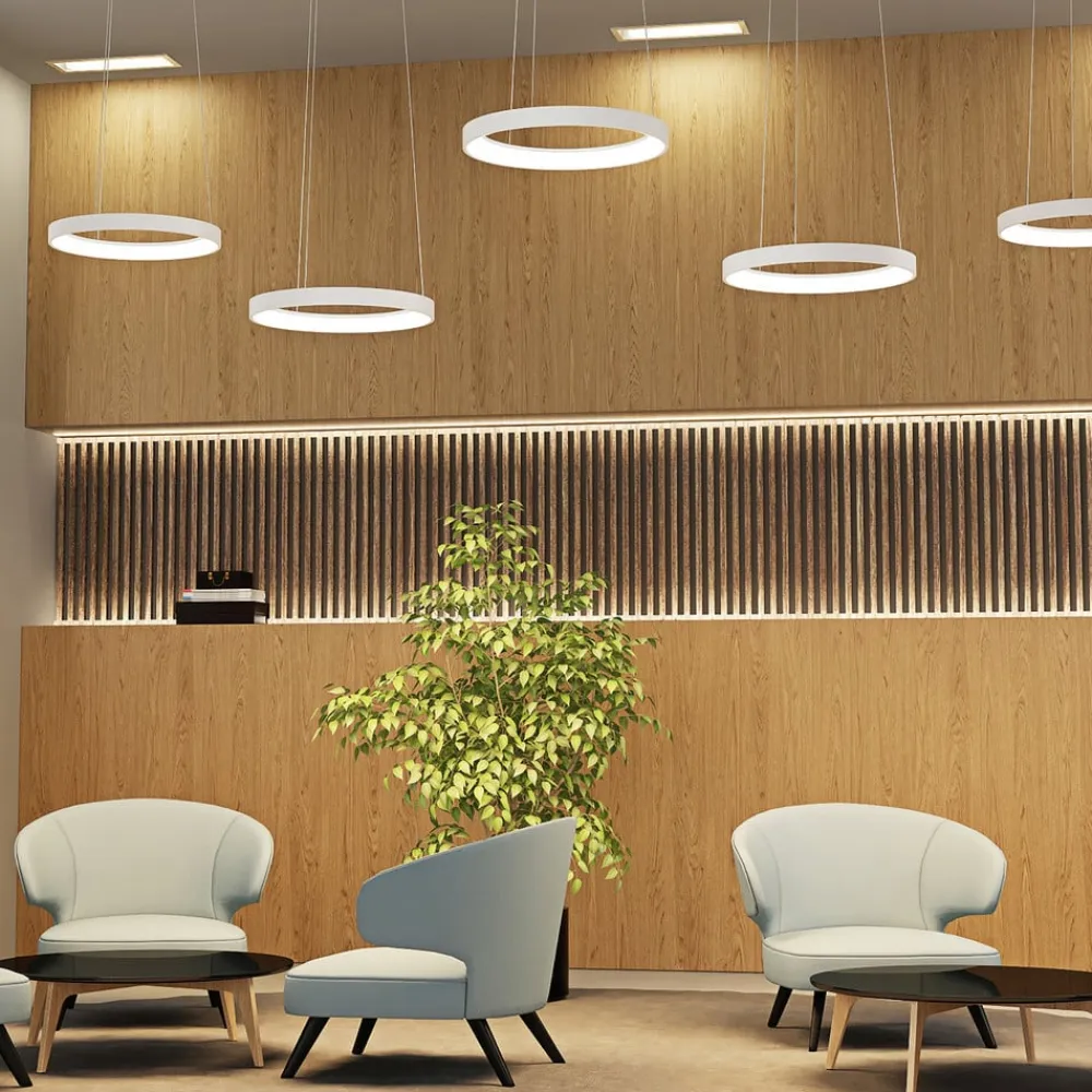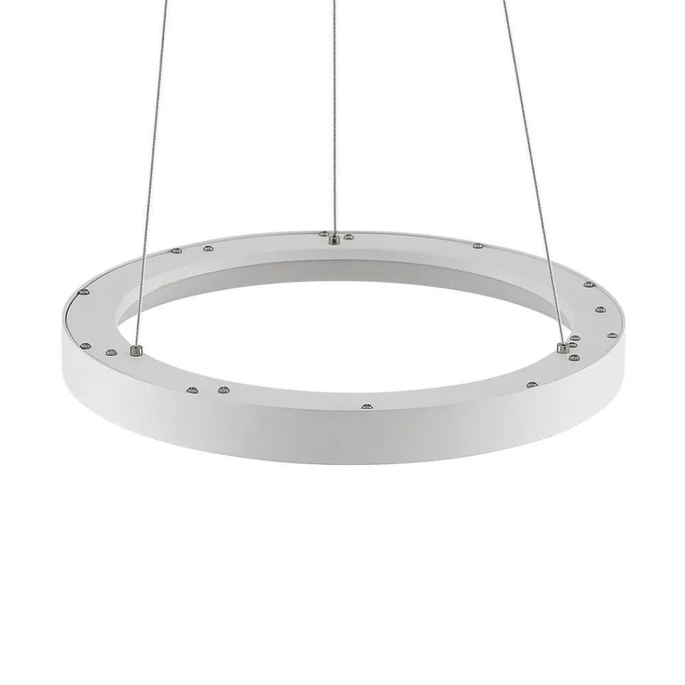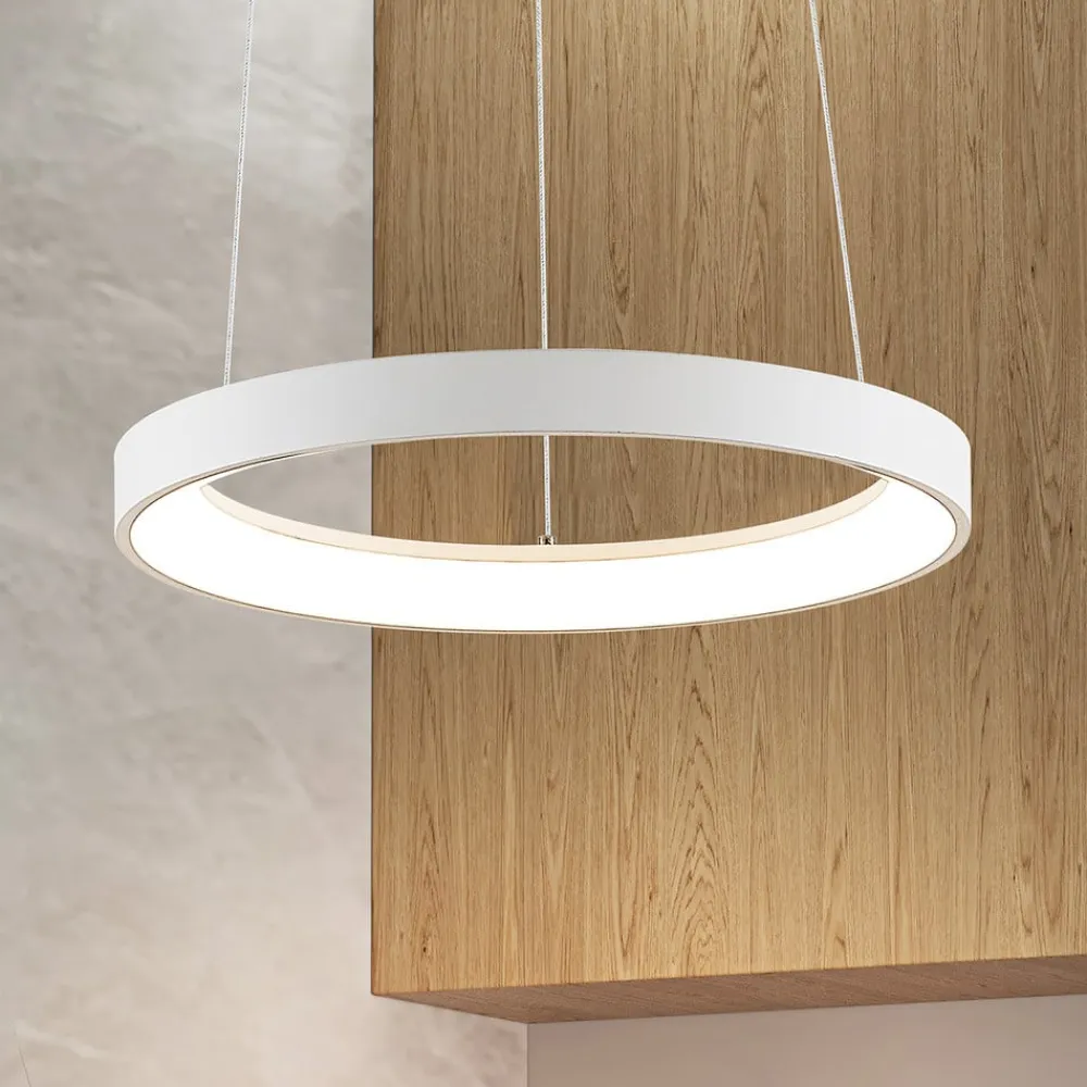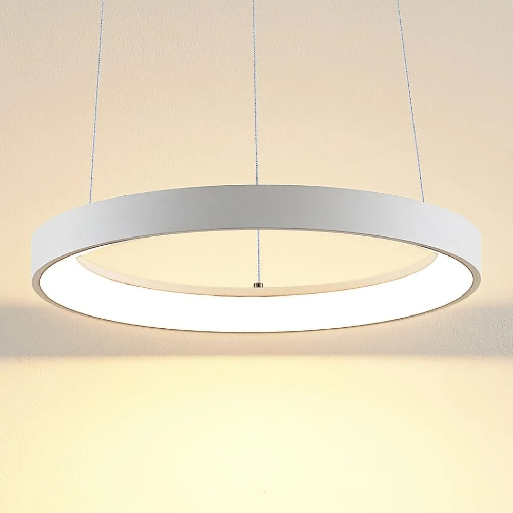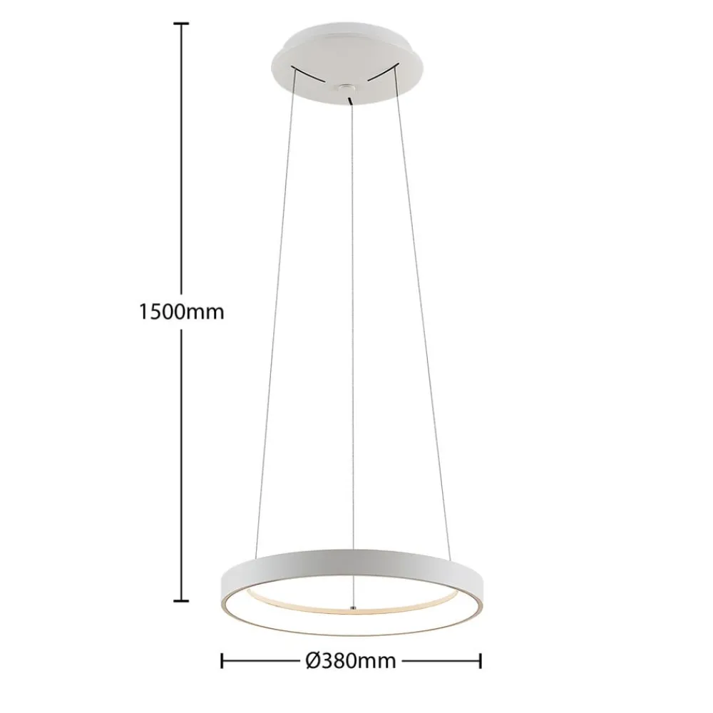 Vivy ringformet LED-hængelampe med hvidt stel – smuk som spisepladsbelysning Vivy kan også tolkes som et redesign af en klassisk køkkenlampe, for som pendellampe minder den meget om de ringformede lamper fra tidligere tider, men har et særdeles moderne udseende. Den er også udstyret med moderne LED-teknologi, som er energieffektiv og langtidsholdbar. Sammen med den hvide overflade og de tre ledninger i ophænget ser LED-hængelampens ringformede design meget let og tiltalende ud, hvilket gør Vivy til en særlig stilfuld lyskilde med det helt særlige i moderne indretninger.