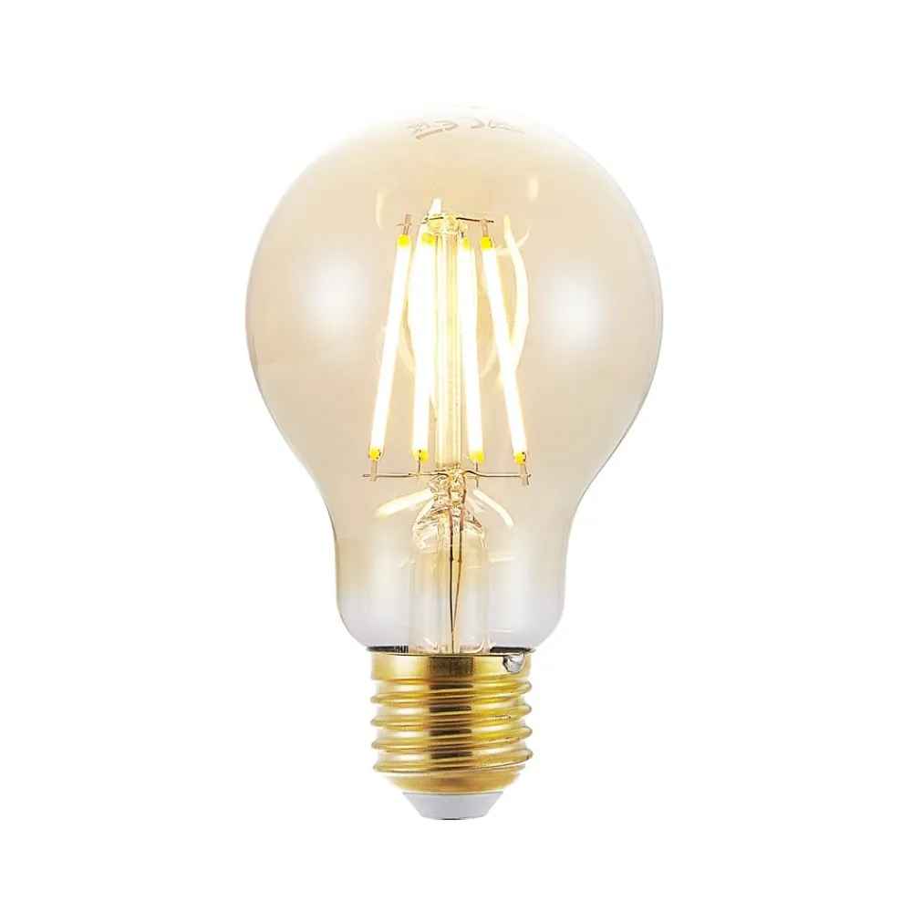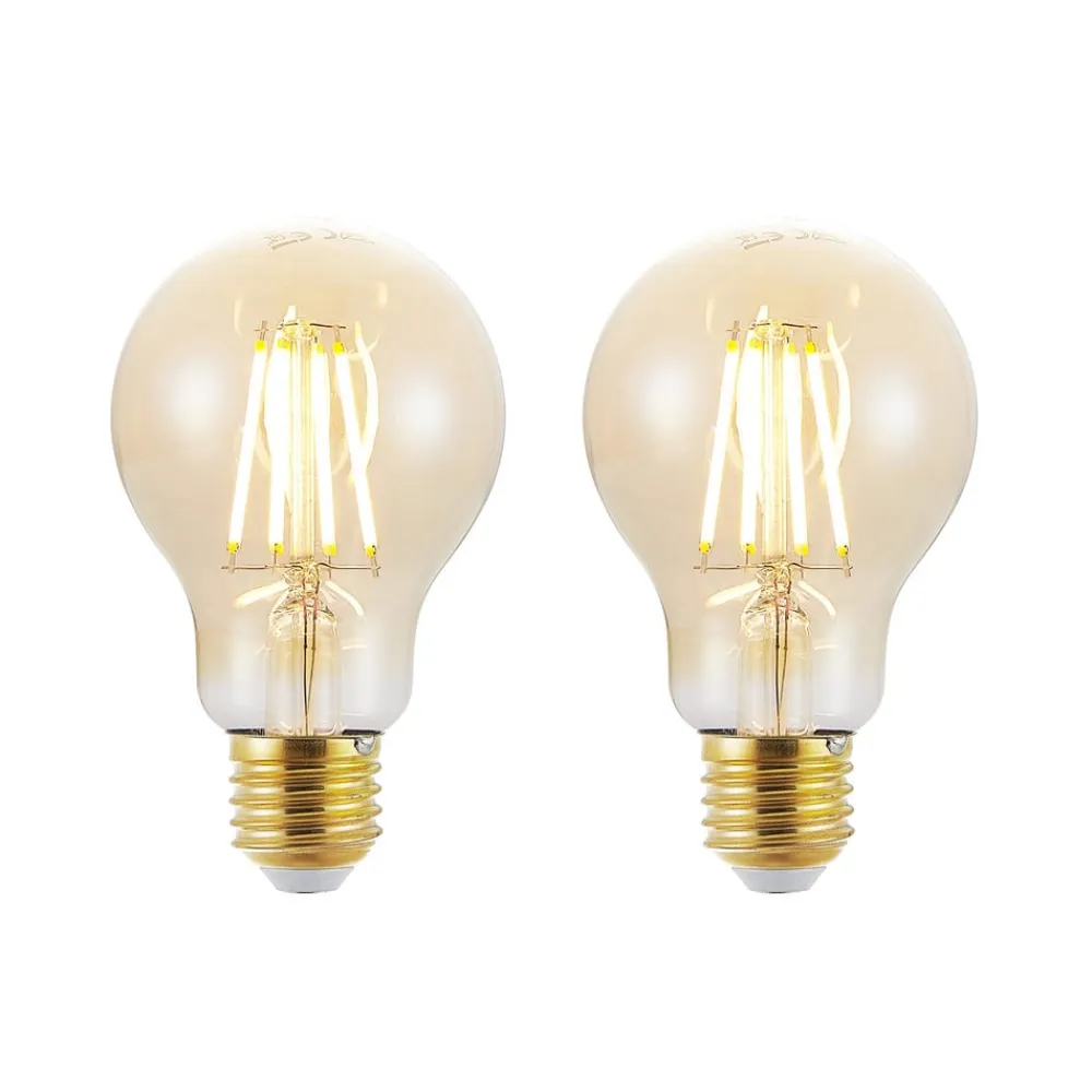 Amber-tinted LED lampe E27 glødetråd 6,5W, tre-niveau dæmpbar i sæt af 2Denne E27 LED lampe er et rigtig godt valg til alle armaturer, hvor lyskilden er synlig. LED-glødetråden bag ravfarvet glas kan via den eksisterende lysafbryder skiftes i tre lysstyrker uden ekstra lysdæmper (100%, 55%, 20%).- Lampen leveres i et praktisk sæt med 2 stk