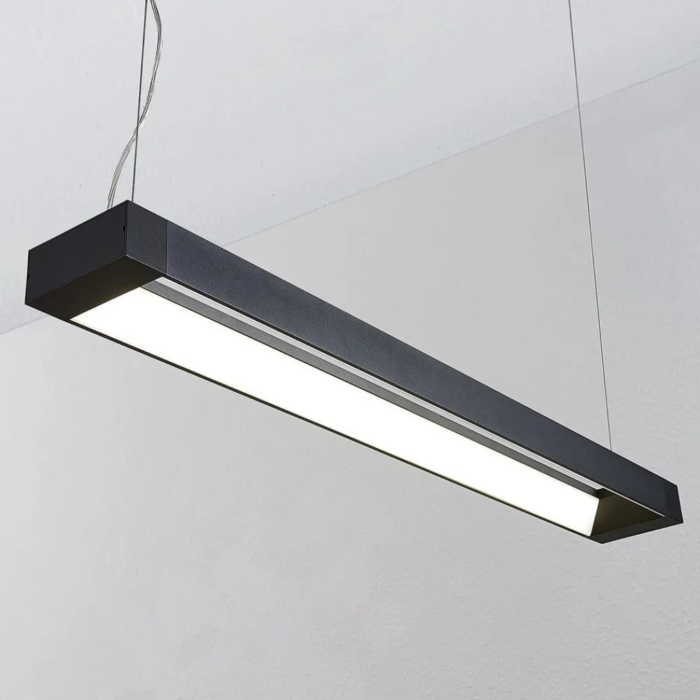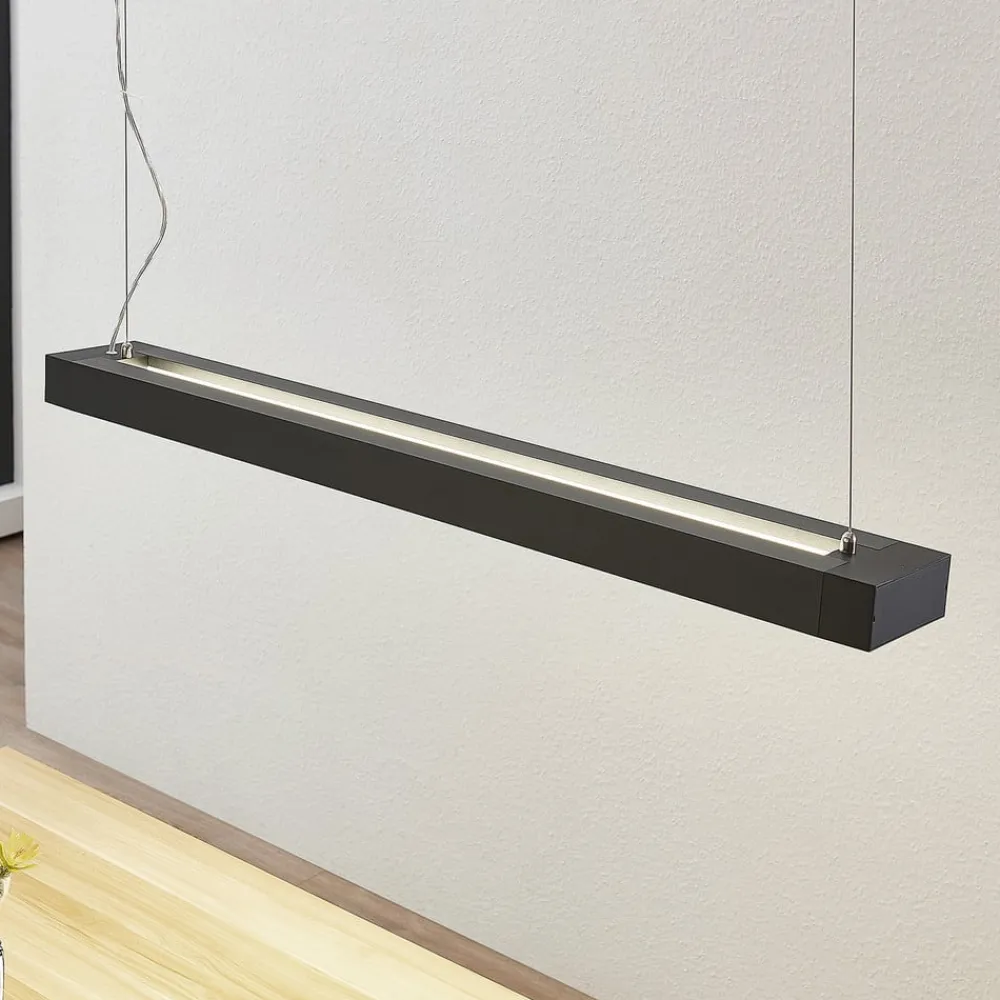 Cuna LED-kontorpendellampe i rektangulær form og med sort overflade Denne pendellampe med kraftigt lysende, energieffektive LED’er er ideel til at oplyse et område. Det universalhvide lys giver dig mulighed for at koncentrere dig om dit arbejde i lange perioder. Skærmens ramme har en kantet form og er lavet af aluminium med en sort overflade, der ser meget tidløs ud. Lysets strålevinkel er 120°. Tekniske data: – Strålevinkel 120° – Universalhvidt lys – Slagfasthedsklasse IK03 – SDCM < 5 – Mulighed for gennemfortrådning