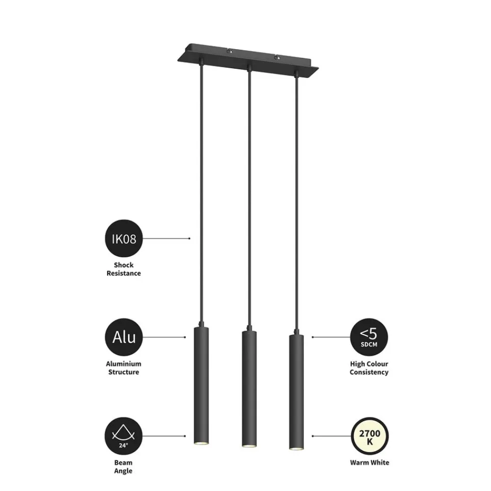 Langstrakt, 3 lyskilder Franka LED-pendellampe med smalle lyscylindre i sort Franka er ideel til belysning af bordflader eller smalle bar- og køkkenborde. De tre lampeskærme er lavet af aluminium og har et usædvanligt smalt design. Det æstetiske overordnede design suppleres af en sofistikeret sort overflade, der ser cool og elegant ud på samme tid. Lyset er rettet nedad og har med en strålevinkel på 24 grader en tendens til at sætte fokus på omgivelserne. Takket være tre LED-pendellamper kan pendlen bruges til at skabe et passende lysniveau i stuen, samtidig med at energiforbruget holdes lavt. Det giver en god effektivitet, som er helt i tråd med de moderne forbrugeres behov – Høj slagfasthed (IK08) – SDCM < 5
