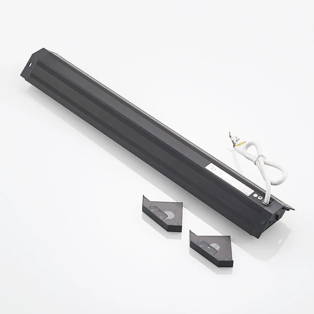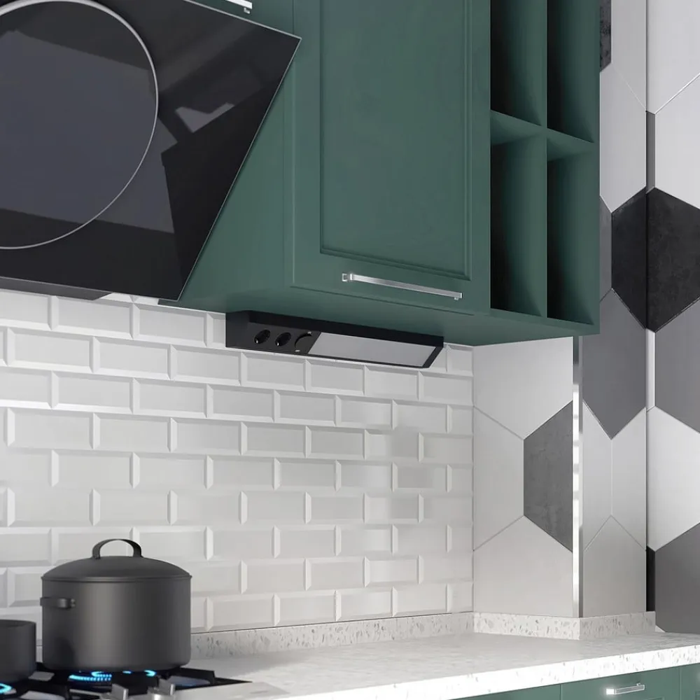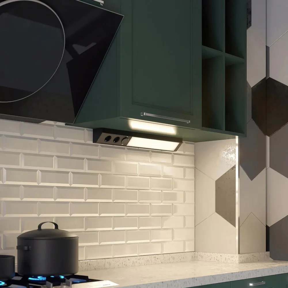 Mørk Ovano LED-underskabsbelysning med to ekstra strømtilslutninger Ovano LED-underskabsbelysningen kommer i et sort design. Huset er lavet af aluminium og giver en elegant farvekontrast til den hvide plastskærm. Det gør, at det varmhvide lys fra de permanent installerede LED’er sendes behageligt og homogent ud i omgivelserne. Ovano er en praktisk lyskilde, der kan monteres over en bordplade, f.eks. i køkkenet. Den har også to integrerede stikkontakter, der kan forsyne andre apparater med strøm, hvis det er nødvendigt – 2 integrerede stikkontakter – Varmhvid lysfarve (3.000 K)