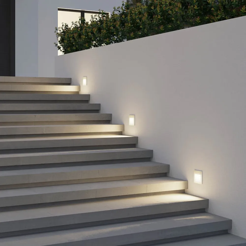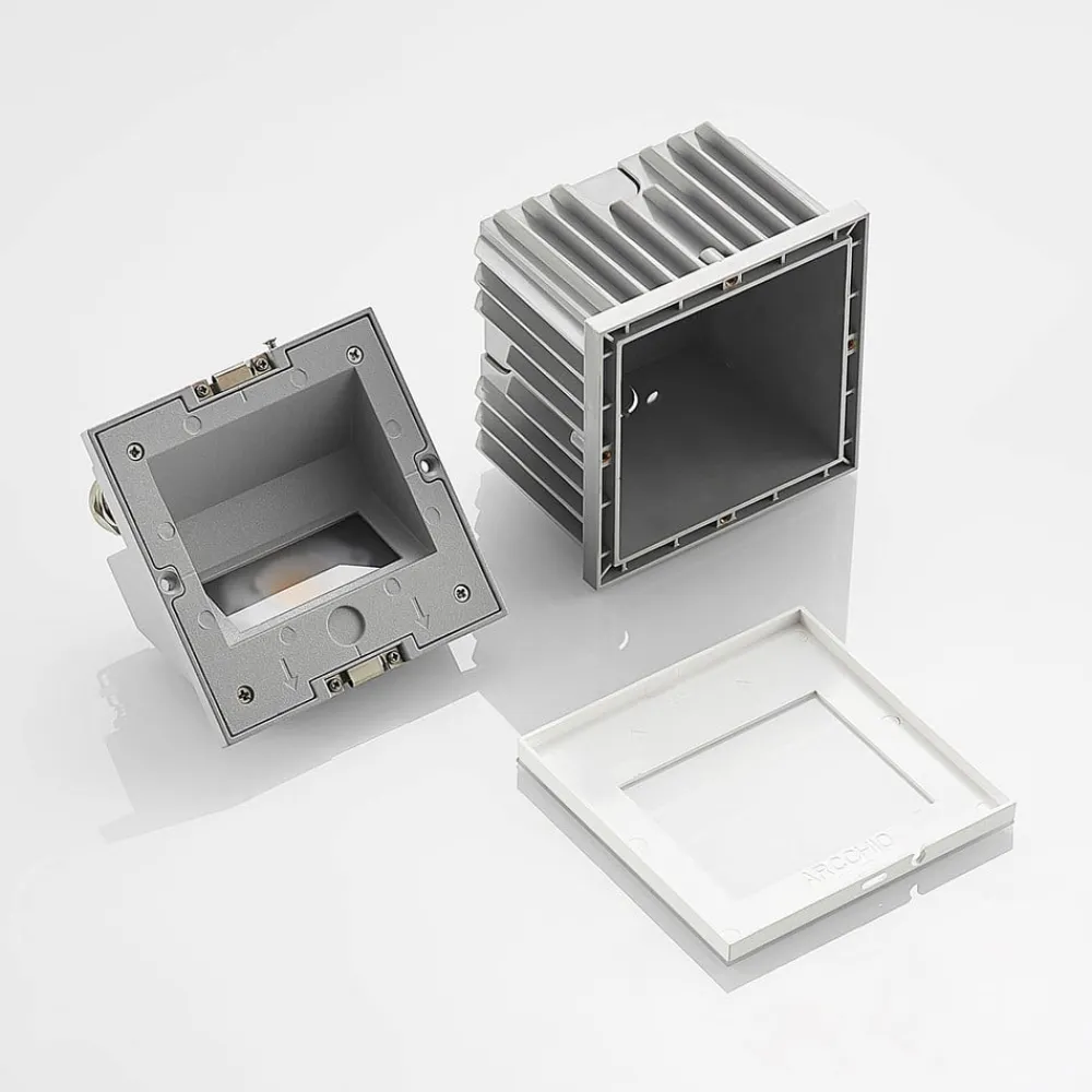 Firkantet LED-vægindbygningslampe Zamo med hvid afskærmning og glasplade, IP65 LED-vægindbygningslampen Zamo er perfekt til udendørs belysning. Den har en kapslingsgrad på IP65, hvilket betyder, at den også kan bruges udendørs i lang tid. Uanset om det er i indgangspartiet, som trappebelysning eller i indkørslen – Zamo giver pålidelig belysning, som også er energibesparende. Afskærmningen er lavet af aluminium og designet i en enkel hvid farve og udstyret med et glasdæksel, så den kan passe ind i forskellige miljøer uden at være umiddelbart iøjnefaldende. Det varmhvide lys har en behagelig og indbydende effekt og kommer bedst til sin ret, når flere af disse armaturer placeres på række.