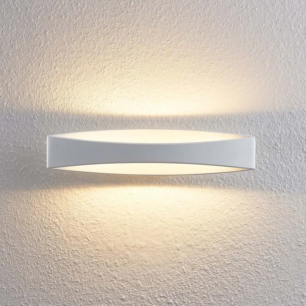 Harmonisk look til hele opholdsrummet: Den hvide LED-væglampe Jelle med afrundet form Jelle imponerer med et meget æstetisk design og en særlig smuk lyseffekt, der udstråler ren hygge. Væglampen drives af LED’er, der sidder bag det konvekse dæksel og oplyser det konkave element på væggen. Disse LED’er er effektive og derfor både lyse og energibesparende, hvilket er præcis den kombination, som forbrugerne ønsker. På grund af lampekroppens blændeformede design kan lyset sendes opad og nedad uden at blænde, hvorved denne type belysning har en meget hyggelig effekt og kan bruges i gangen såvel som i stuer og soveværelser. Det harmoniske udtryk forstærkes af den helt hvide aluminiumsoverflade – ideel til mange moderne rum!