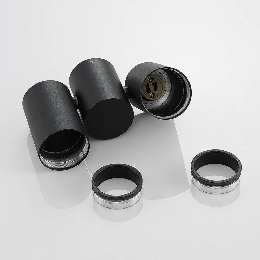 Gesina 2 lyskilder LED-spotlight med sort overflade og drejelige skærme LED-loftlampen Gesina har tre cylindriske elementer, hvoraf to er skærmene, og det midterste er loftbeslaget. Da hvert lampehoved kan drejes, kan lysmønstret justeres efter behov for at belyse de ønskede områder i rummet. Den sorte finish har et diskret udseende og passer godt til moderne boligstile. Lampen kan bruges i et køkken, en gang eller et opholdsrum.