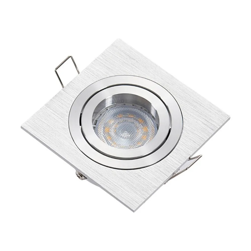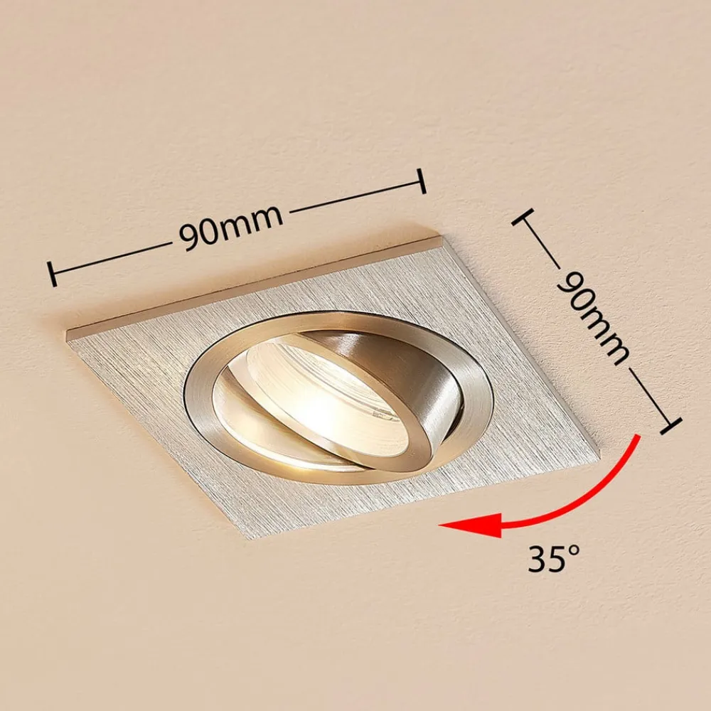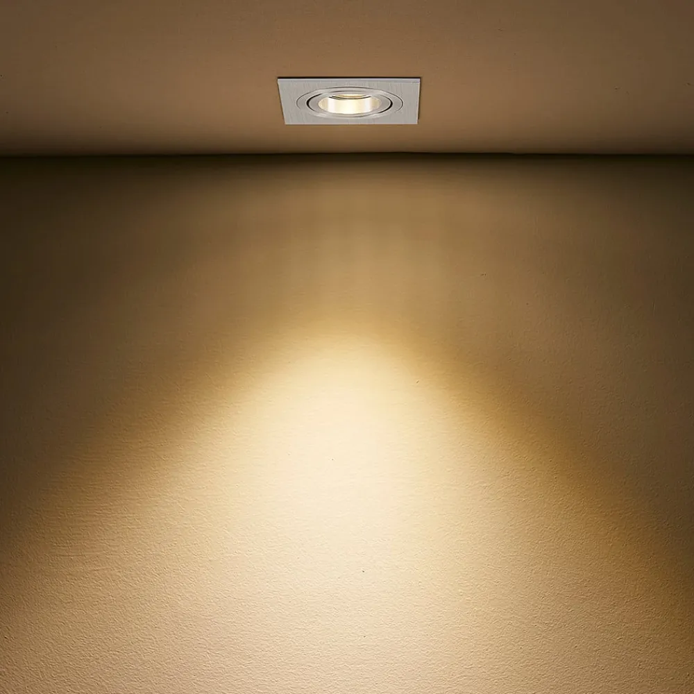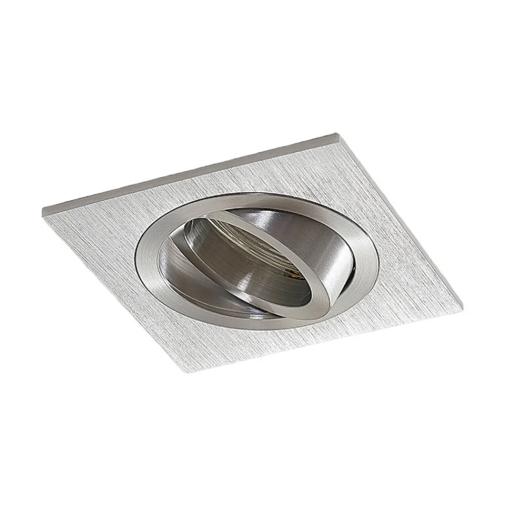 Kantet indbygningsarmatur Sophia i aluminium Den kantede krop på dette indbygningsarmatur suppleres i midten af en rund lyskildeindsats, som er bevægelig i stedet for fast. Den kan vippes op til 25°, så lysretningen kan justeres bedre. Med sin overflade i børstet aluminium passer Sophia indbygningsarmatur til mange stilarter.