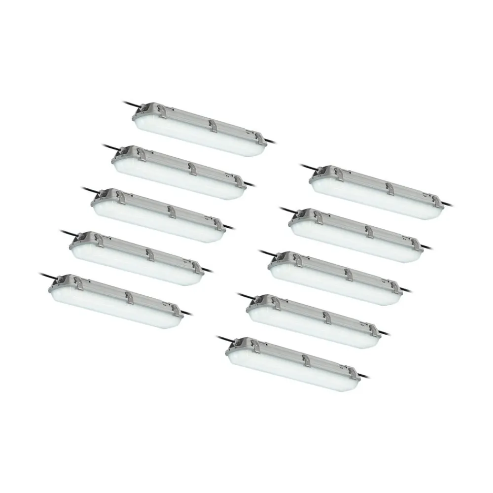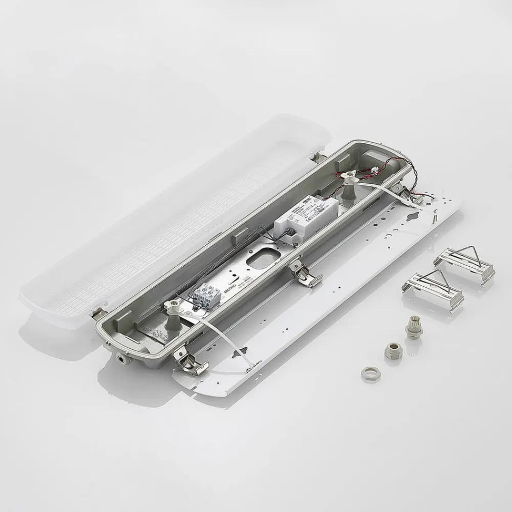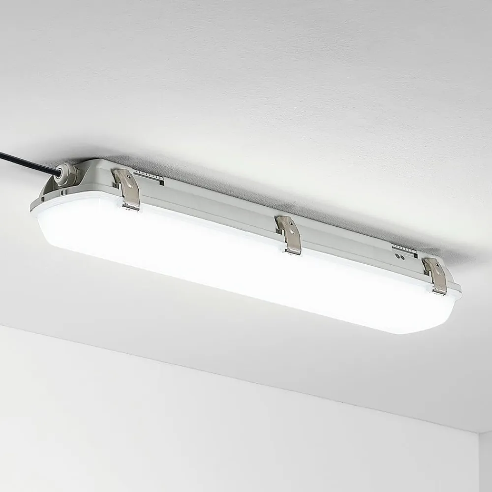 Rao LED-påbygningslampe til brug i fugtige rum, IP65, valgbar lysfarve Denne LED-påbygningslampe er et reelt aktiv, når det gælder lys, især i kommercielle områder eller i fugtige rum omkring huset og gården, for eksempel garagen eller en kælder. Med sin høje kapslingsgrad kan snavs og fugt næppe skade diffusorlyset, og det er derfor også velegnet til rum, hvor luftfugtigheden kan være højere. LED’erne er særligt effektive og giver tilstrækkelig lysstyrke med et forholdsvis lavt strømforbrug. Deres lys er flimmerfrit, og før installationen kan du vælge mellem tre lysfarver, som kan vælges ved hjælp af den integrerede DIP-kontakt. Takket være den høje grad af slagfasthed er Rao et særligt robust armatur – Mulighed for gennemfortrådning – IK08 slagfasthedsklasse – SDCM < 5 – Leveres i et praktisk sæt med 10 stk