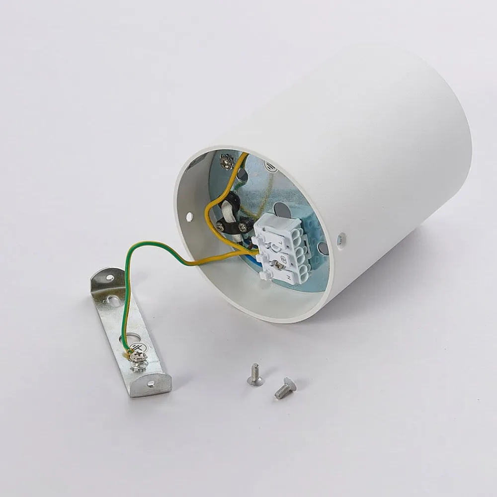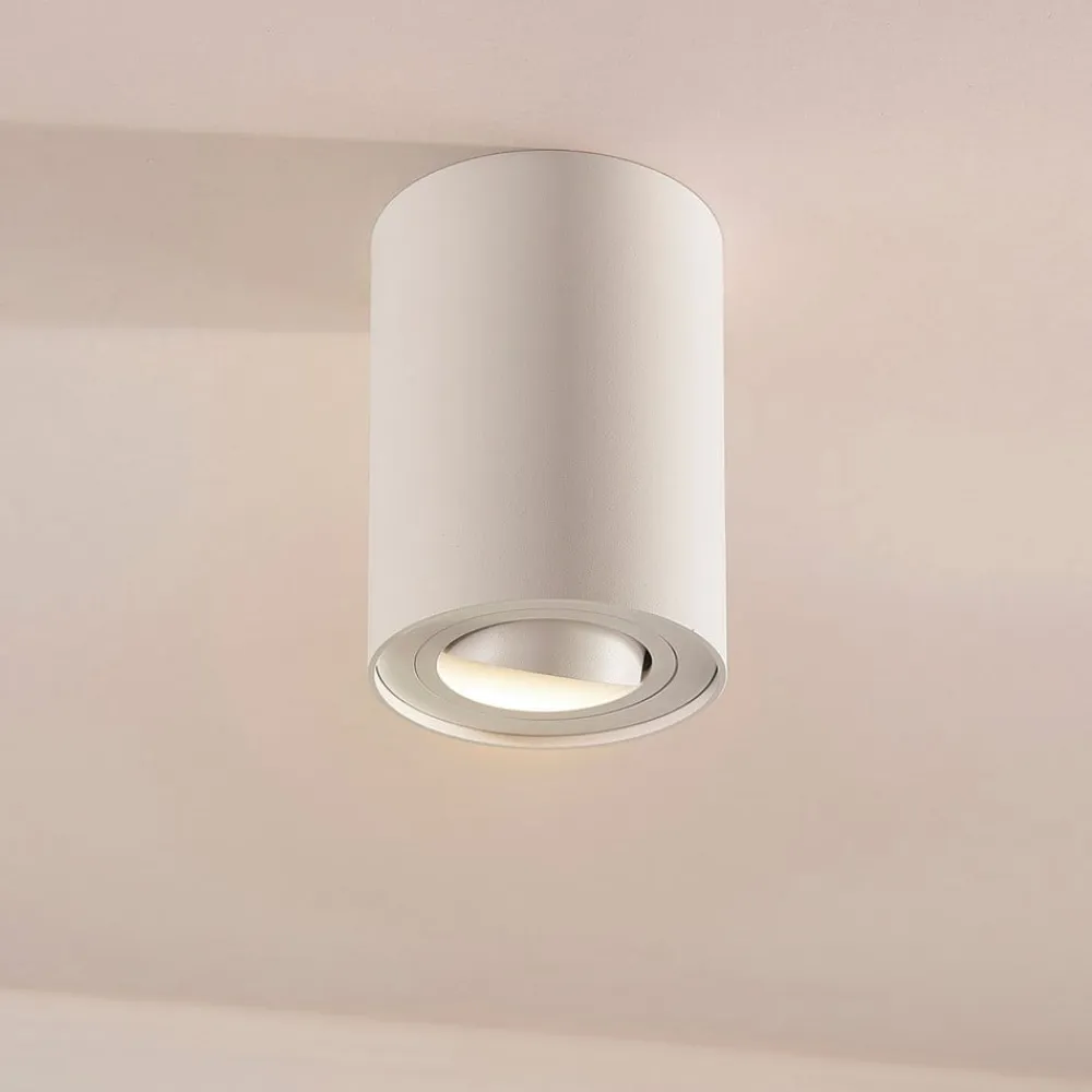 Cylindrisk loftspot Jolina med justerbar lysemission Dette loftspot med hvid overflade har et enkelt og moderne design, som gør det velegnet til en lang række anvendelser. Den drives med en GU10 halogenpære på op til maksimalt 50 watt. Lysudstrålingen kan justeres variabelt takket være den 25° bevægelige indvendige reflektor, så bestemte områder i rummet kan fremhæves på en dygtig måde – med skrueløs hurtigkoblingsterminal af høj kvalitet (holdbar, sikker og værktøjsfri fjedermekanisme)