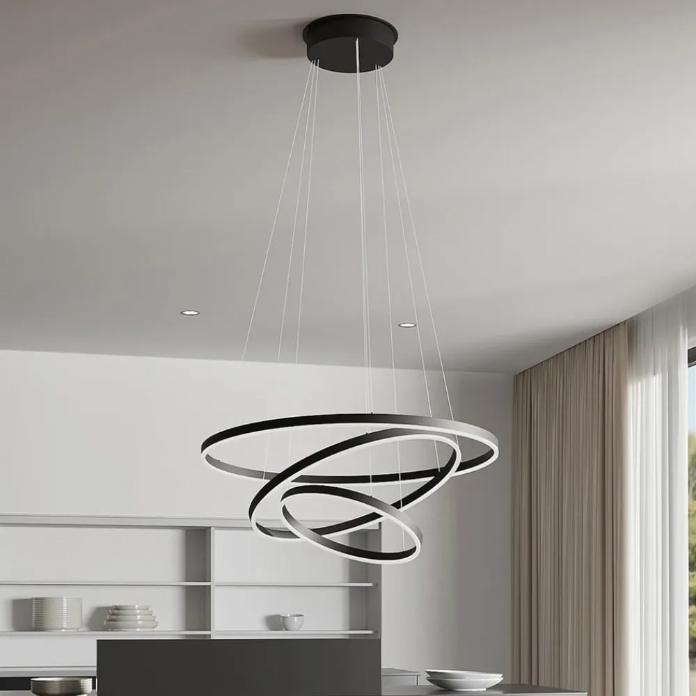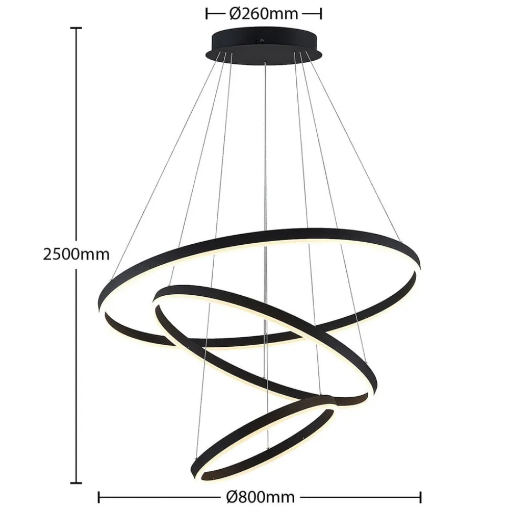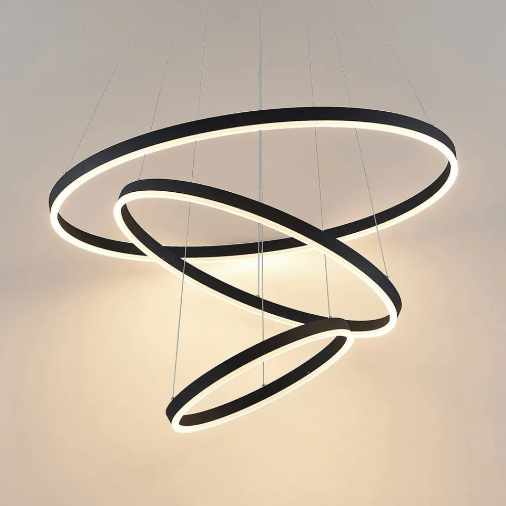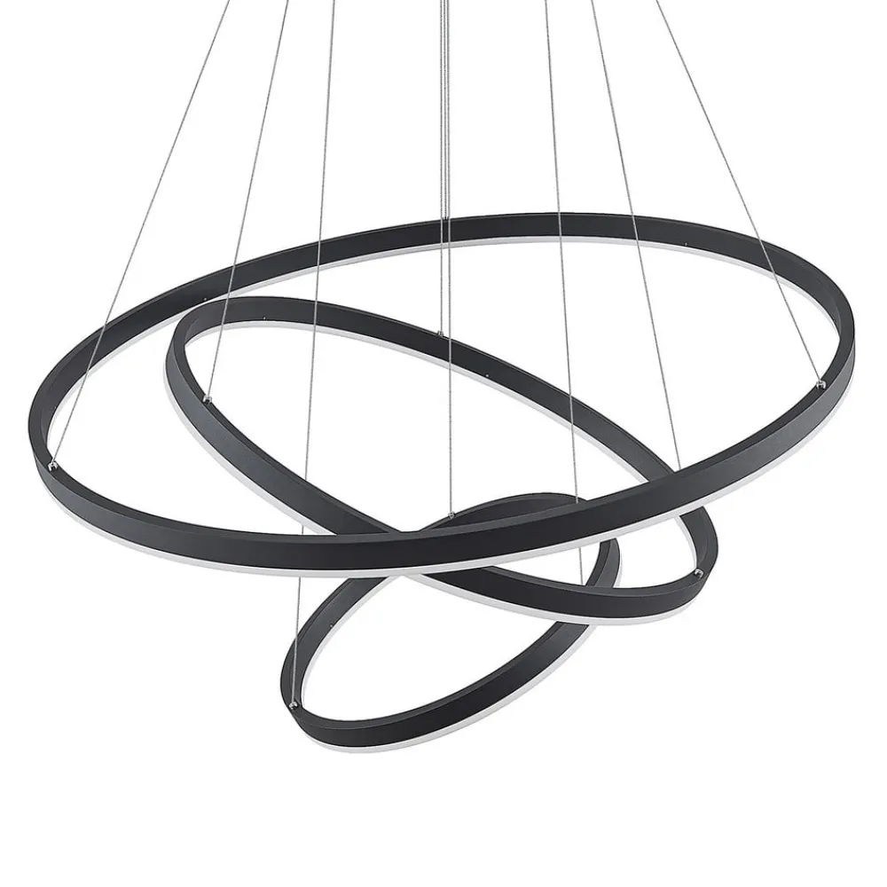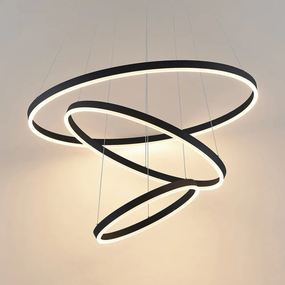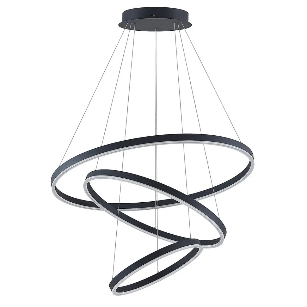 Rund, 3 lyskilder Albiona LED-pendellampe til moderne spisepladser Albiona imponerer med sit trendy minimalistiske design og er en pendellampe, der består af tre aluminiumsringe i forskellige størrelser, som er ophængt i en vinkel. Varmhvide LED’er lyser kraftigt på undersiden af ringene og giver rummet eller spisebordet en god grundbelysning. Den sorte overflade ser markant og moderne ud og spotlighter en kølig elegance. Albiona LED-pendellampen imponerer også med sin høje kvalitet og er en meget stilfuld lyskilde til moderne opholds- og spiseområder.