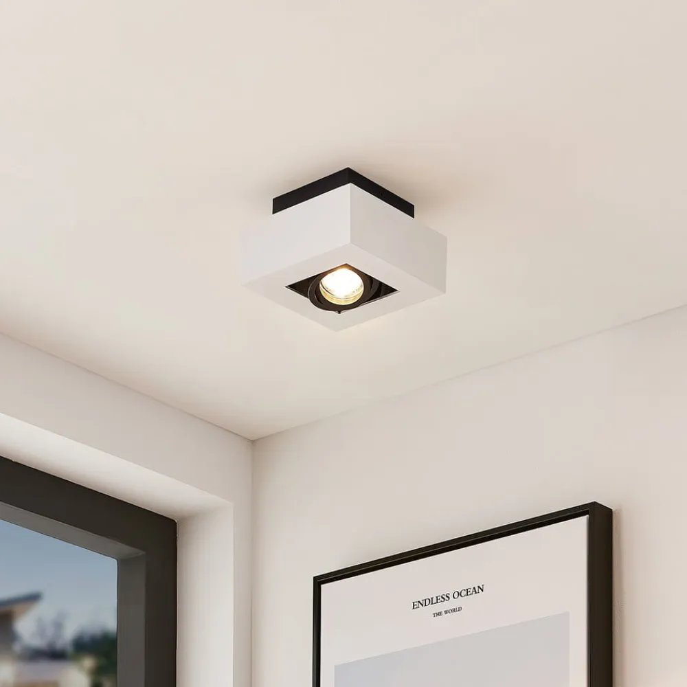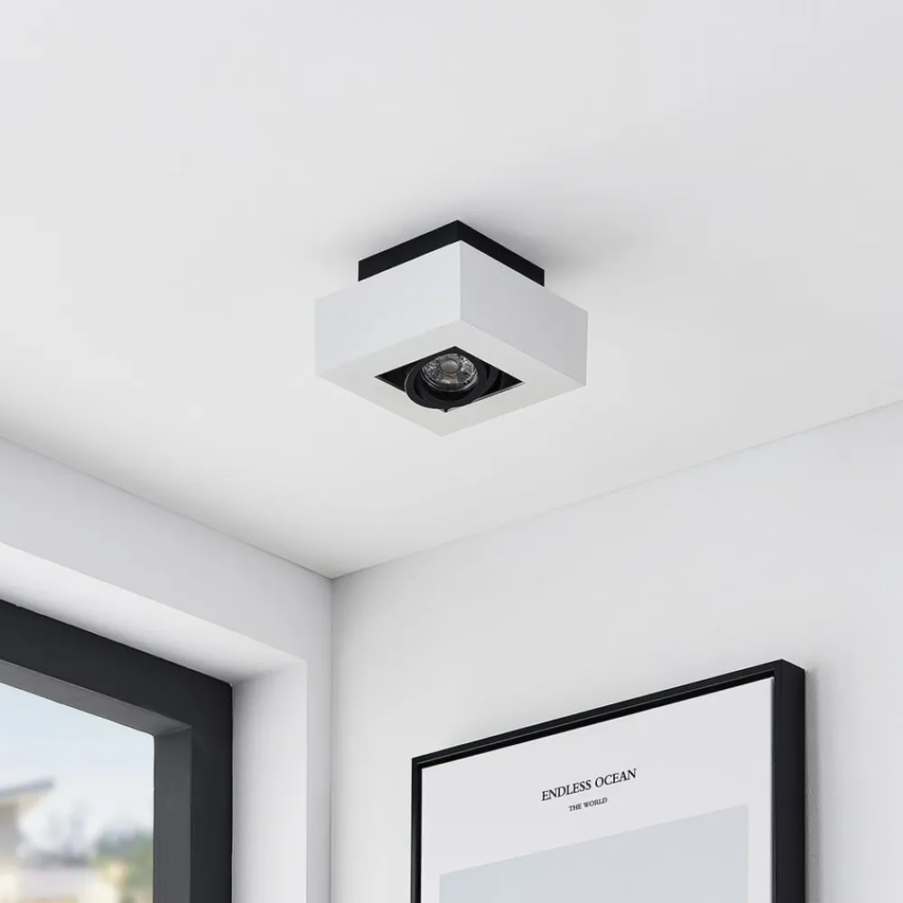 Firkantet Vince loftlampe med vippeindsats Den praktiske Vince loftlampe er et minimalistisk og moderigtigt tilbehør til hjemmet. Der er valgt en enkel hvid farve til huset, mens lyskilden er omgivet af en sort ramme. Designet i et klassisk farveskema og en kubisk form kan denne downlight nemt integreres i en række forskellige indretningsstile. Fordelen ved dette armatur er, at du kan styre lysets retning efter behov, da spotlightet kan drejes fleksibelt. En energibesparende LED-pære kan sættes i GU10-fatningen, som fås separat som tilbehør. Loftlampen har en skrueløs tilslutningsklemme til hurtig, bekvem og værktøjsfri tilslutning af ledningerne.