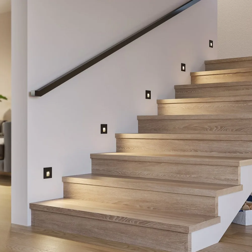 Diskret LED-vægindbygningslampe Vexi i sort aluminium Vexi er den perfekte ledsager, når det gælder belysning af trin eller korridorer og hjælper med at belyse potentielle snublefarer. Den er lavet af aluminium og har et kompakt, kantet design. Lampekroppen forsvinder næsten helt ind i væggen og efterlader kun en firkantet plade på vægoverfladen. Lysfarven på LED’erne kan indstilles ved hjælp af en dip-switch på bagsiden (2.700 K, 3.000 K og 4.000 K). Med sit enkle design passer Vexi LED-vægindbygningslampen nemt ind i indretningsstilen og kan kombineres med andre lamper i serien – god farvegengivelse CRI > 90 – CCT – mulighed for gennemfortrådning