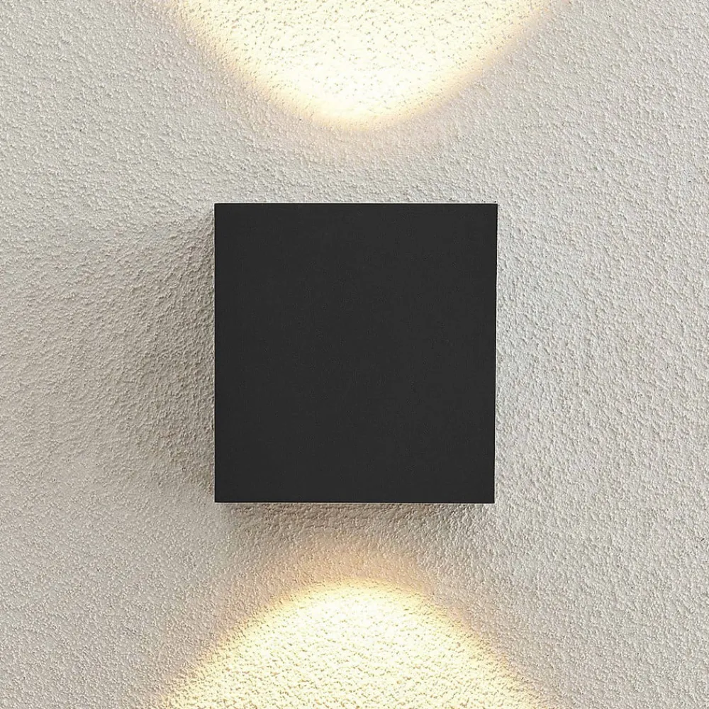 Grafitfarvet udendørs LED-væglampe Tassnim af aluminium Den udendørs LED-væglampe Tassnim imponerer med sit enkle udseende. Lampekroppen er lavet af grafitfarvet aluminium, og dens firkantede form minder om en terning. Indeni sidder de fastmonterede LED’er, som giver et perfekt lys til udendørsarealer. Kapslingsgraden IP65 gør armaturet perfekt til installation i en indkørsel eller på en terrasse, da det er støvtæt og beskyttet mod vandstråler. Derfor trodser Tassnim udendørs LED-væglampen ubesværet udendørs vejrforhold og giver også det nødvendige lys. Dens enkle og diskrete design gør, at den nemt kan integreres i husets vægge uden at forstyrre den arkitektoniske stil.