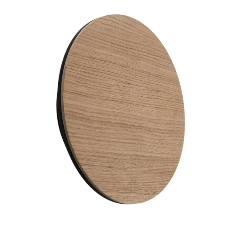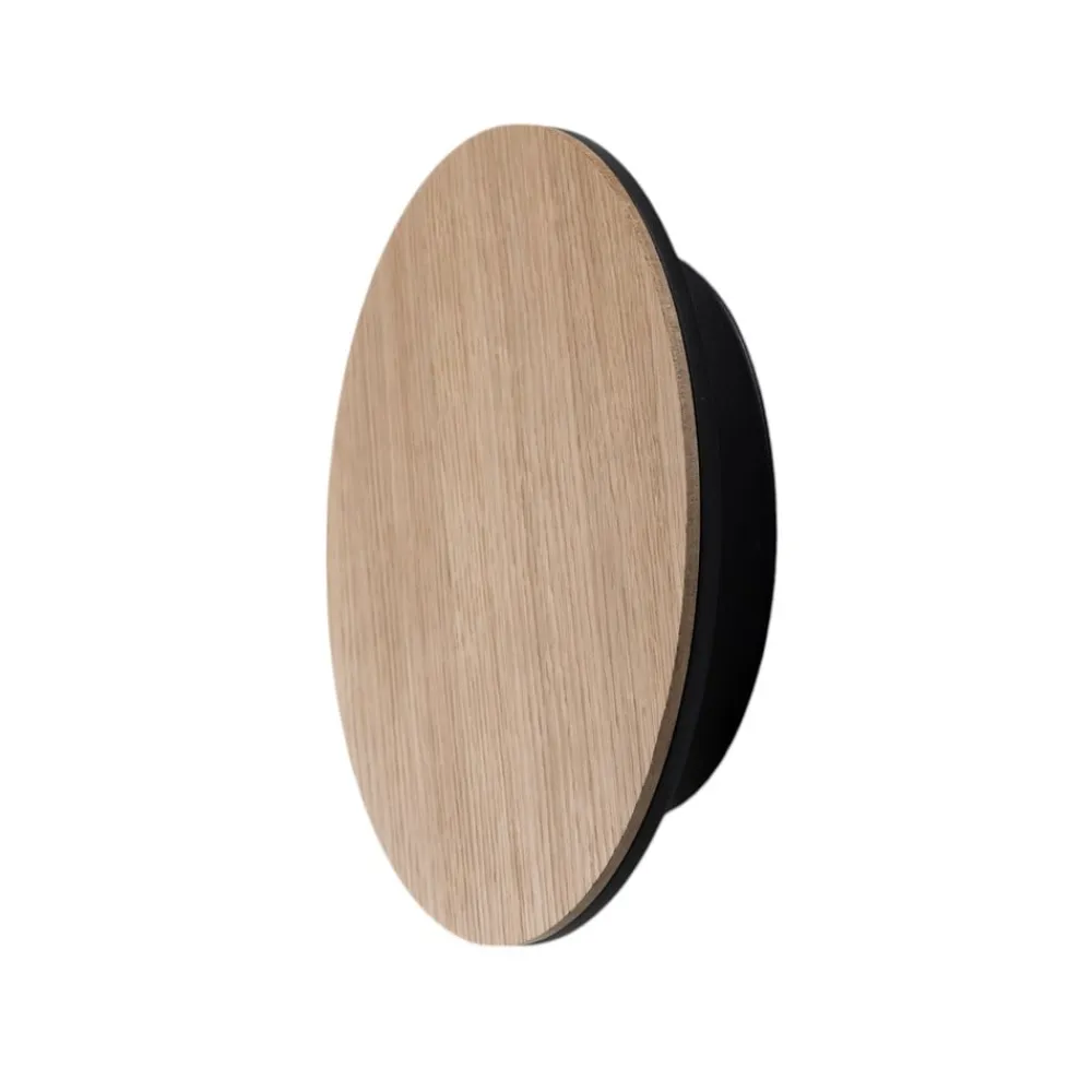 Rund Orios LED-væglampe med træafdækning og indirekte lysudsendelse Orios LED-væglampen er designet i en cirkulær, flad form. Hele fronten optages af et panel af lyst træ. LED-lyskilden er skjult bag det. Dens varmhvide lys udsendes hele vejen rundt til siderne og over væggen, så der ikke er nogen blænding. Produktionen finder sted i Europa.