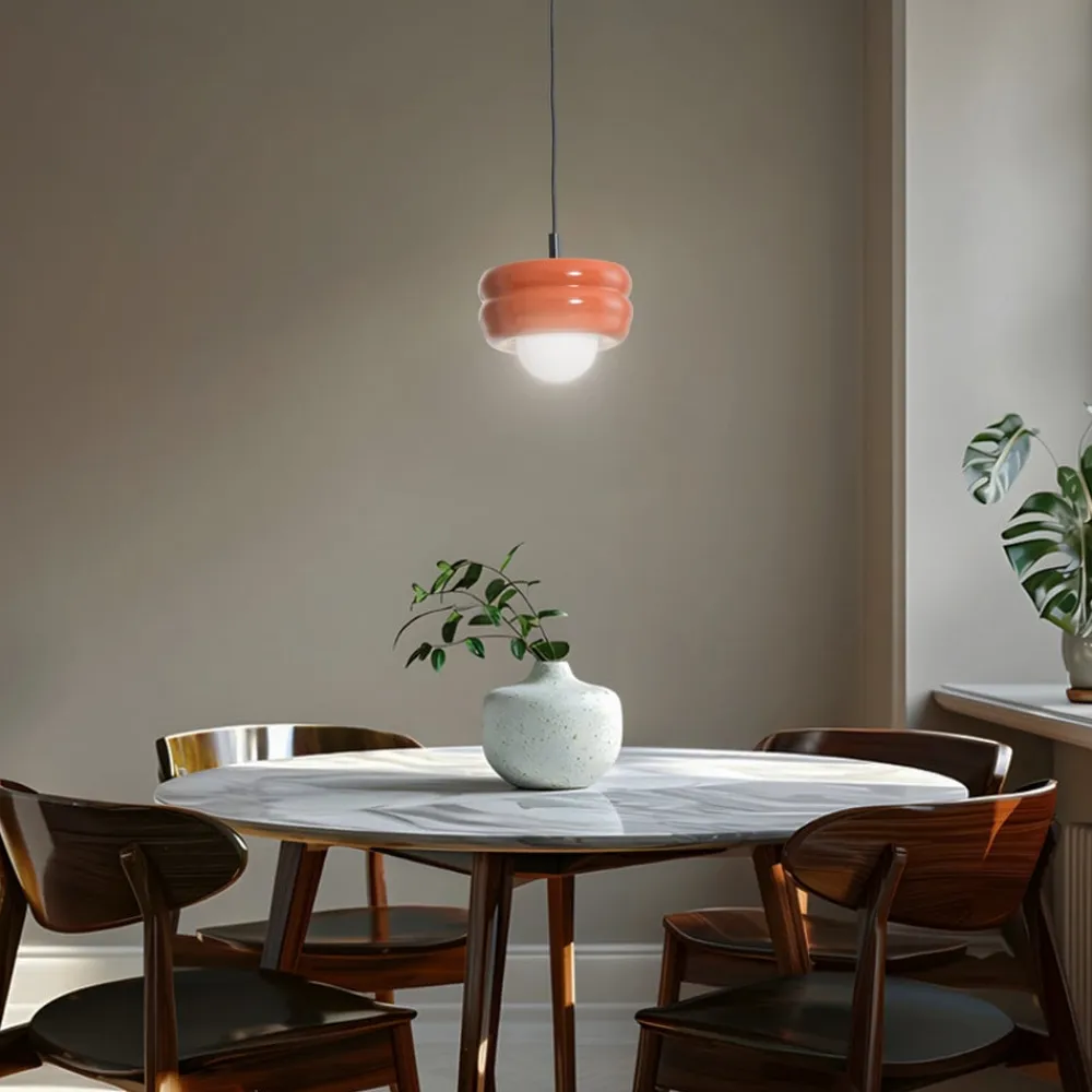 Skærmen på hængelampen Tina er fremstillet af højkvalitetsglas, den udvendige skærm er terrakottafarvet, den lille kugle i midten er opal hvid for at sikre en jævn lysudbredelse. Denne lampe er ikke kun et blikfang, men også fremstillet i Europa, hvilket vidner om høj kvalitet. Enkeltstående eller monteret i grupper er den velegnet til belysning af små og store borde i spisestuen, stuen eller køkkenet.