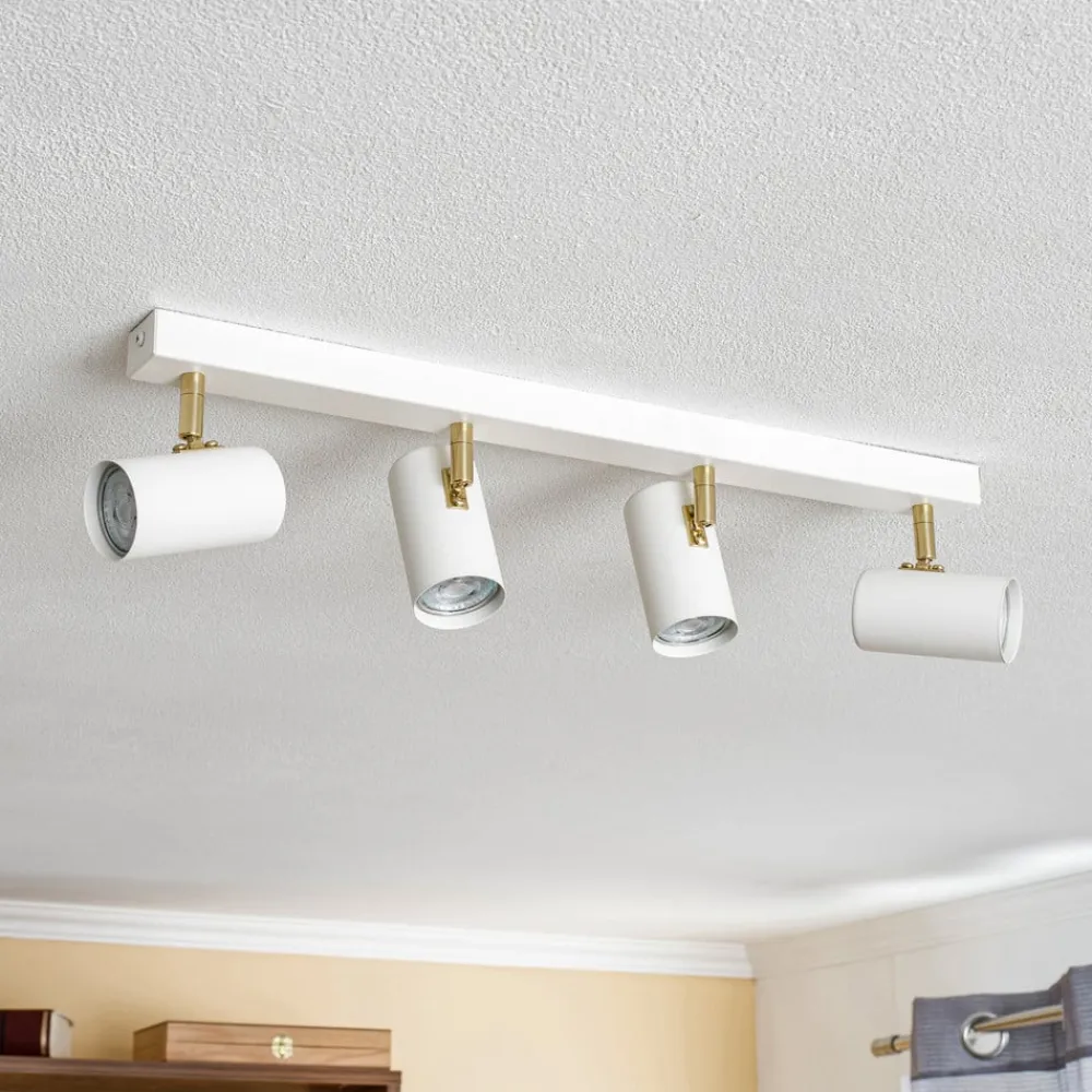 Loftspot Lund i hvidt forener moderne design med funktionel alsidighed. Denne spot med 4 lyskilder er fremstillet af højkvalitetsstål og præsenterer sig i en tiltalende kombination af hvid mat og guldfarve. Denne stilfulde lampe passer perfekt ind i forskellige boligområder som stuen, soveværelset, entreen og spisestuen og giver ethvert rum et særligt præg.