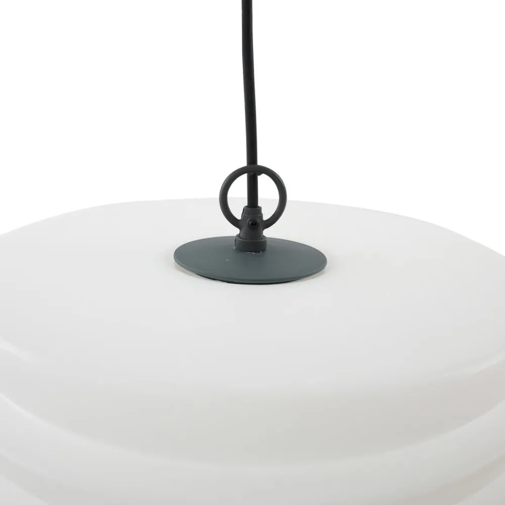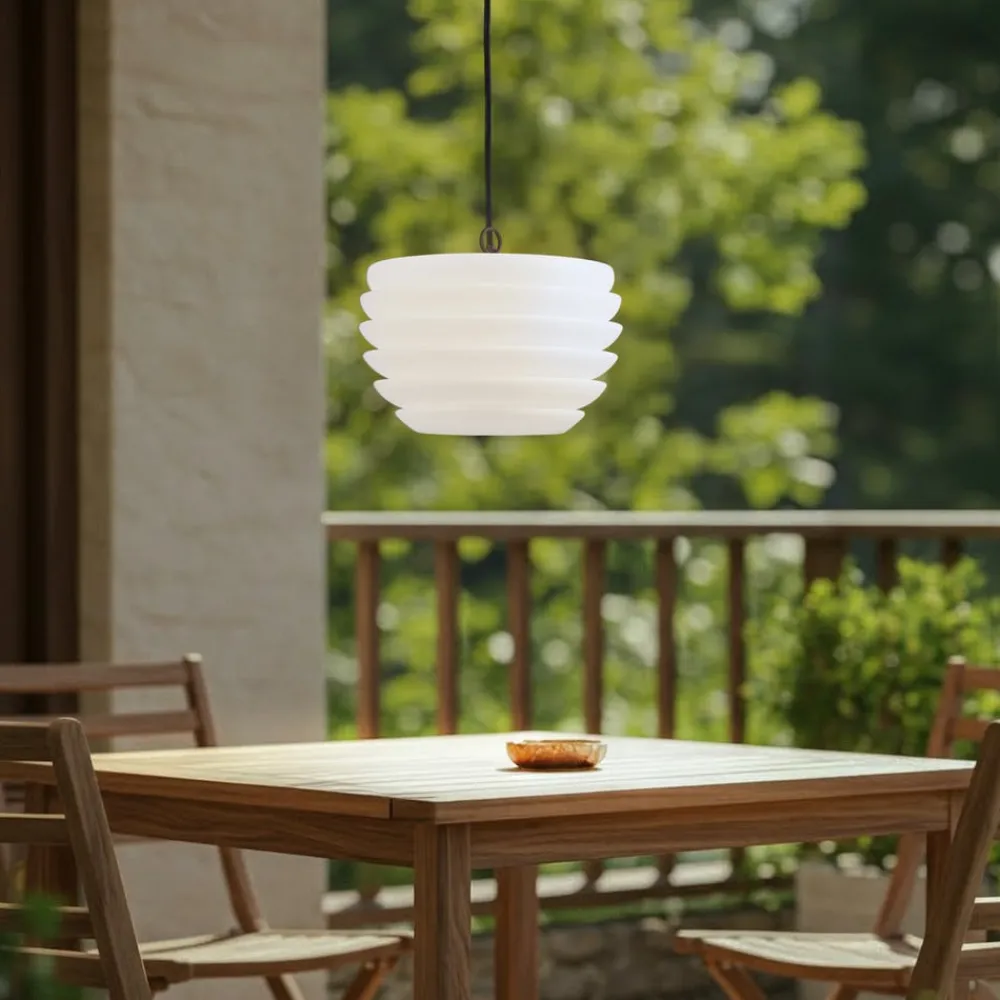 Hvid udendørs pendel Arona, IP65 Den udendørs pendel Arona imponerer ved første øjekast med sit dekorative udseende. Den hvide plastskærm består af flere lameller, der er halvcirkelformede og går over i hinanden. Det skaber en tiltalende lyseffekt, som udsender et meget ensartet lysmønster takket være den regelmæssige form. Pendlen er støvtæt og beskyttet mod vandstråler, hvilket betyder, at den uden tøven kan installeres hvor som helst udendørs.