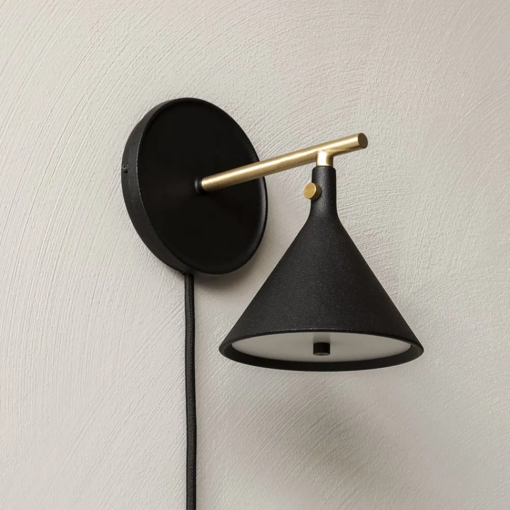 Cast LED-væglampe med stik og dæmper – kan bruges udendørs og på badeværelser Cast-væglampen kombinerer trekantede, lineære og runde elementer i en sofistikeret silhuet. Den geometriske form i sort aluminium med messingdetaljer er målrettet og nærværende. Armaturet er udstyret med en LED-pære, der styres via en drejedæmper på kablet. Takket være kapslingsgraden IP44 giver armaturet et blødt, blændfrit lys i mange rum, herunder badeværelser, brusere og udendørs, hvilket bidrager til stemningen i rummet. Bemærk venligst: Skærmen kan ikke justeres efter installationen. Sørg for den korrekte vinkel, før du monterer den på væggen – Hvis armaturet er tilsluttet via et vægudtag, kan det dæmpes ved hjælp af en dæmper (ekskl.)