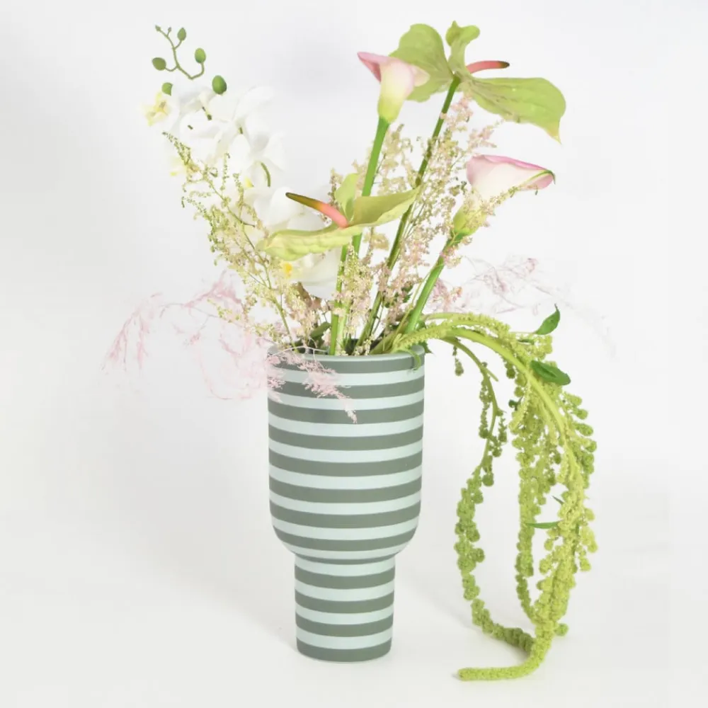 Vase og skulptur i ét: Varia keramikvase Indviklede linjer, forskellige former og levende farver gør livets rejse interessant, og det er, hvad du får med Varia-vasen. De forskellige vaser i denne serie fra AYTM kan også bruges som urtepotter og er et ægte blikfang i dit hjem med deres fantastiske stil og egenart. De levende farver i kombination med de usædvanlige former forstærkes yderligere af det stribede mønster. Vaser som disse ser godt ud sammen, men kan også tiltrække opmærksomhed hver for sig. Produktinformation: Fremstillet af keramik. Plejeanvisning: Tør genstanden af med en fugtig klud for at fjerne snavs og støv. Tør om nødvendigt efter med en blød, tør klud.
