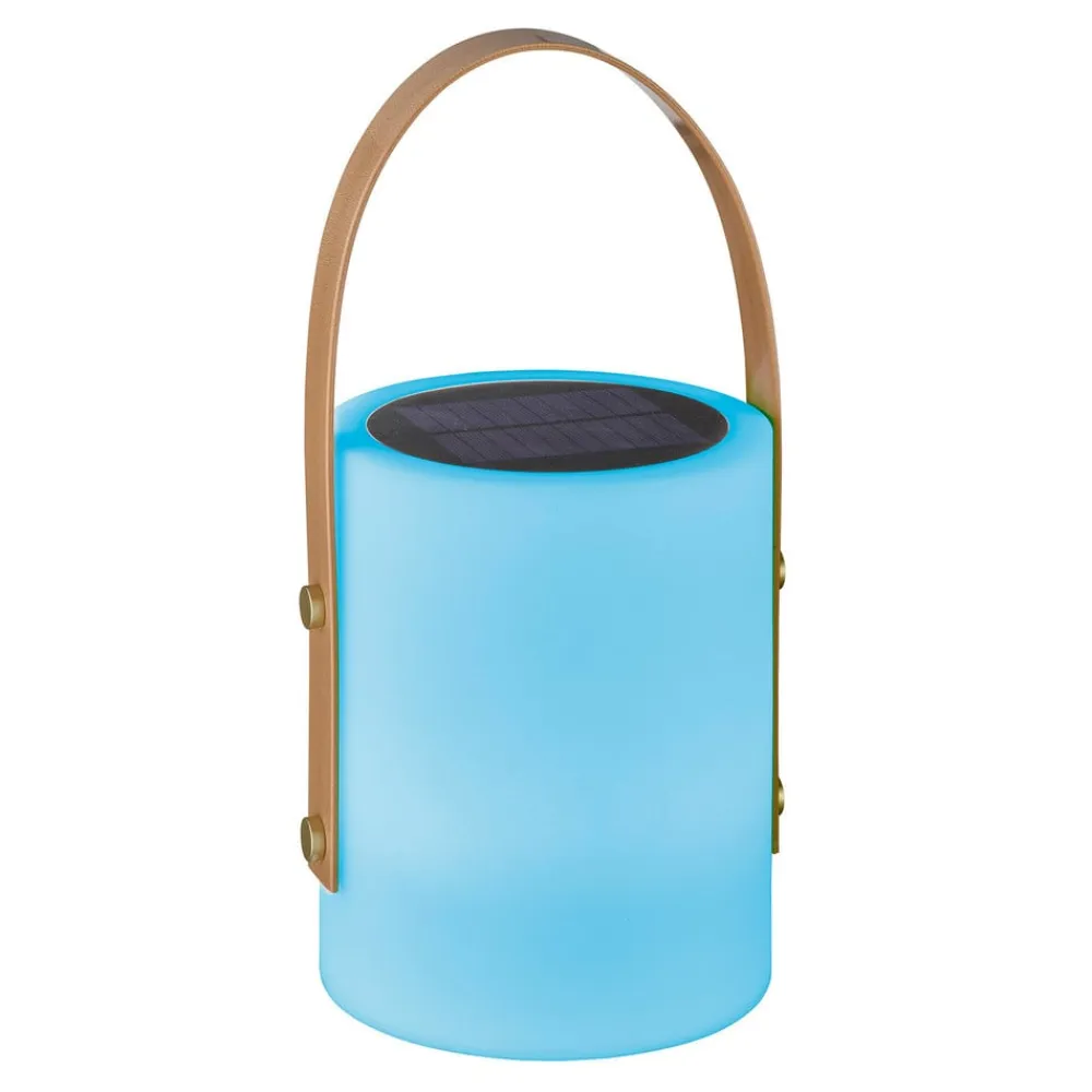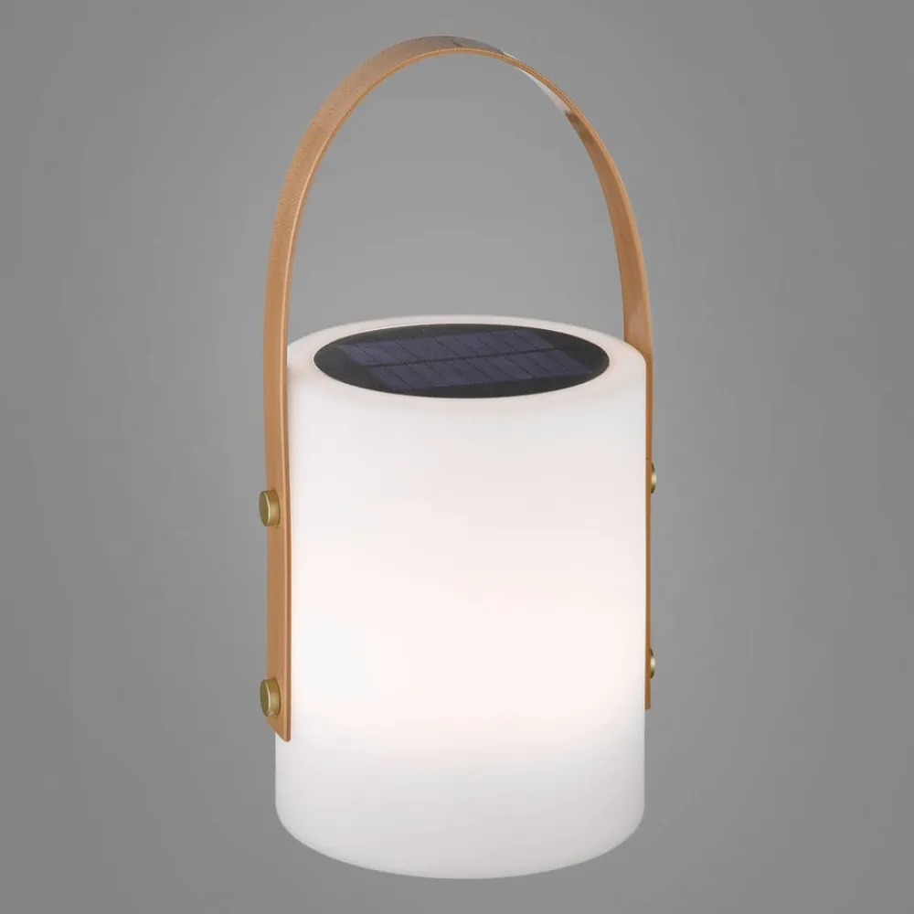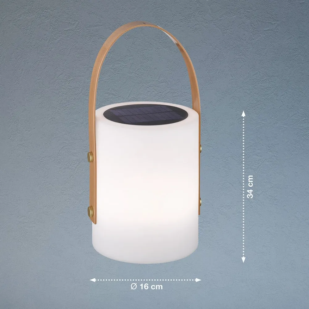 På toppen af LED-bordlampen Bari er der monteret et solcellemodul, som lagrer solenergi og får den indbyggede LED-pære til at lyse. Lampen er lavet af hvidt plastik og har en brun bærerem. Den har også IP44-beskyttelse og er derfor ideel til udendørs brug. Bordlampens lysstyrke kan justeres i tre trin (30 % – 60 % – 100 %). Bari har også en RGB-farveskiftfunktion i syv farveniveauer. Funktionerne kan vælges med den medfølgende fjernbetjening.