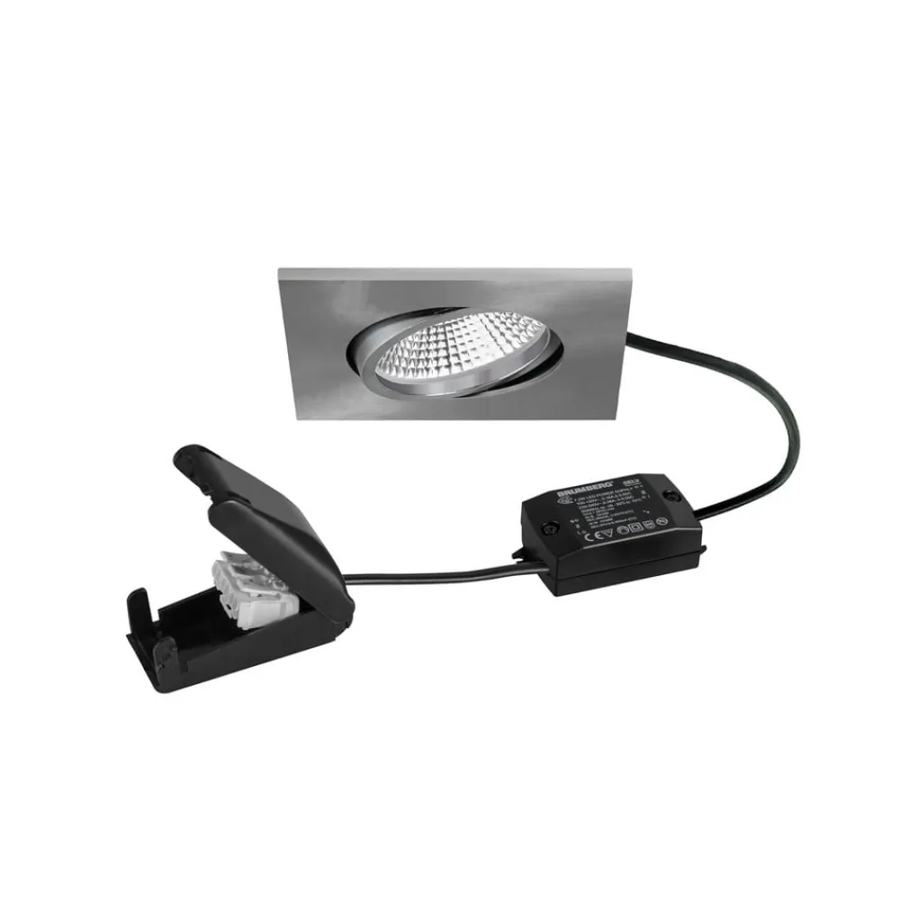 Indbygget LED-spot BB25 IP65 med omskiftelig LED-driver og tilslutningsboks Det vinklede indbyggede LED-spot BB25 med 15° drejeligt spot kan installeres i badeværelser, wellnessområder osv. takket være IP65-beskyttelsesgraden. Spottet kan monteres i lofter med en maksimal tykkelse på 1,7 cm uden værktøj ved hjælp af monteringsfjedre. Den leveres klar til tilslutning med tilslutningsboks og omskiftelig LED-driver og er ikke dæmpbar. Det varmhvide lys udsendes i en vinkel på 36° af sølvreflektoren med rotationssymmetrisk, dybtgående lysfordeling og fordeles optimalt gennem den transparente plastafdækning.