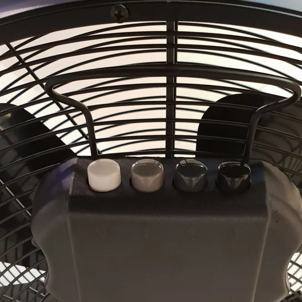 Stor Breeze bordventilator med to fødder i trælook To vandrette, cylindriske træfødder giver Breeze bordventilatoren det helt særlige. De støtter et rundt stålhus med bærehåndtag og beskyttelsesgitter, hvori der er fem plastblade. Funktioner Fire trykknapper på bagsiden er tilgængelige for at slukke for Breeze eller vælge et af de tre hastighedsniveauer. Tekniske data – Kan skiftes til tre hastigheder: 950/1.100/1.250 o/min – Motoreffekt: maks. 50 W – Luftcirkulation: maks. 63,6 m³/min