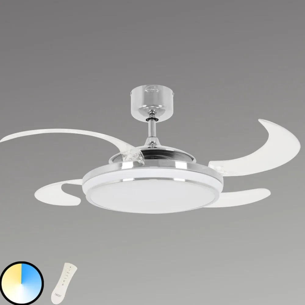 Skinnende forkromet Fanaway Evo 1-loftventilator – integreret LED-lys Fanaway Evo 1-loftventilatoren har et dristigt design og et ekstra, der er værd at se. De gennemsigtige plastvinger kan foldes ind, hvilket reducerer diameteren fra 121 cm til 47,5 cm og sætter fokus på lyset i midten. Med justerbare frem- og tilbagegående funktioner giver Fanaway Evo 1-loftventilatoren behagelig forfriskning om sommeren og jævnt fordelt varme om vinteren, hvilket sparer varmeenergi. Udstyret med belysning: I alt 72 lysdioder giver et klart lys, hvis farvetemperatur kan ændres med fjernbetjeningen: Du kan vælge mellem 3.000 K/4.000 K og 5.000 K, og lyset kan dæmpes i enhver valgt lysfarve. Fjernbetjeningen er inkluderet i leveringsomfanget. Tekniske data Effekt: 60 watt Hastighed: 130/170/230 o/min
