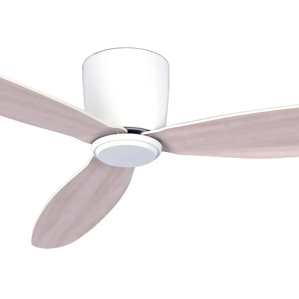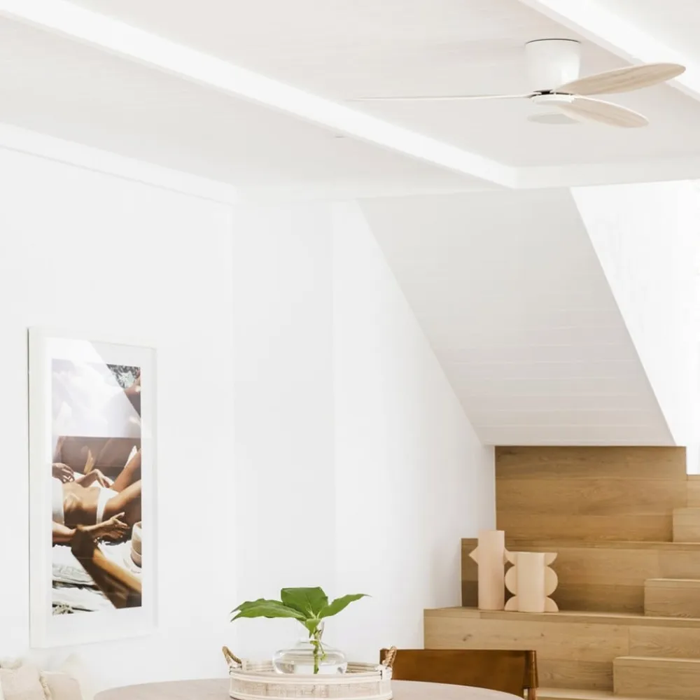 Loftventilatoren Airfusion Radar har et robust, hvidt plastikhus og tre trævinger i egetræsfarve. Takket være DC-motoren er Airfusion Radar særdeles støjsvag og derfor ideel til soveværelset. Også egnet til nedhængte lofter.