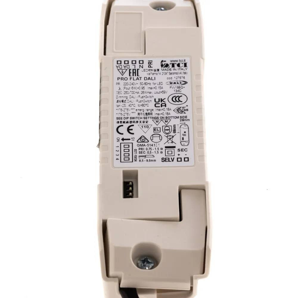 LED-strømforsyningsenhed 13169 DALI til indbyggede LED-armaturer Strømforsyningsenheden med DALI-grænseflade er velegnet til tilslutning af indbyggede LED-armaturer i nedhængte lofter. Den er fremstillet af glasfiberforstærket plast og er udstyret med en 2-polet stikforbindelse – Klemmeområde til trækaflastning mas. Ø 9 mm – primær 220 – 240 V, 50 – 60 Hz – sekundær 350 mA DC 0,35 – 16,8 W