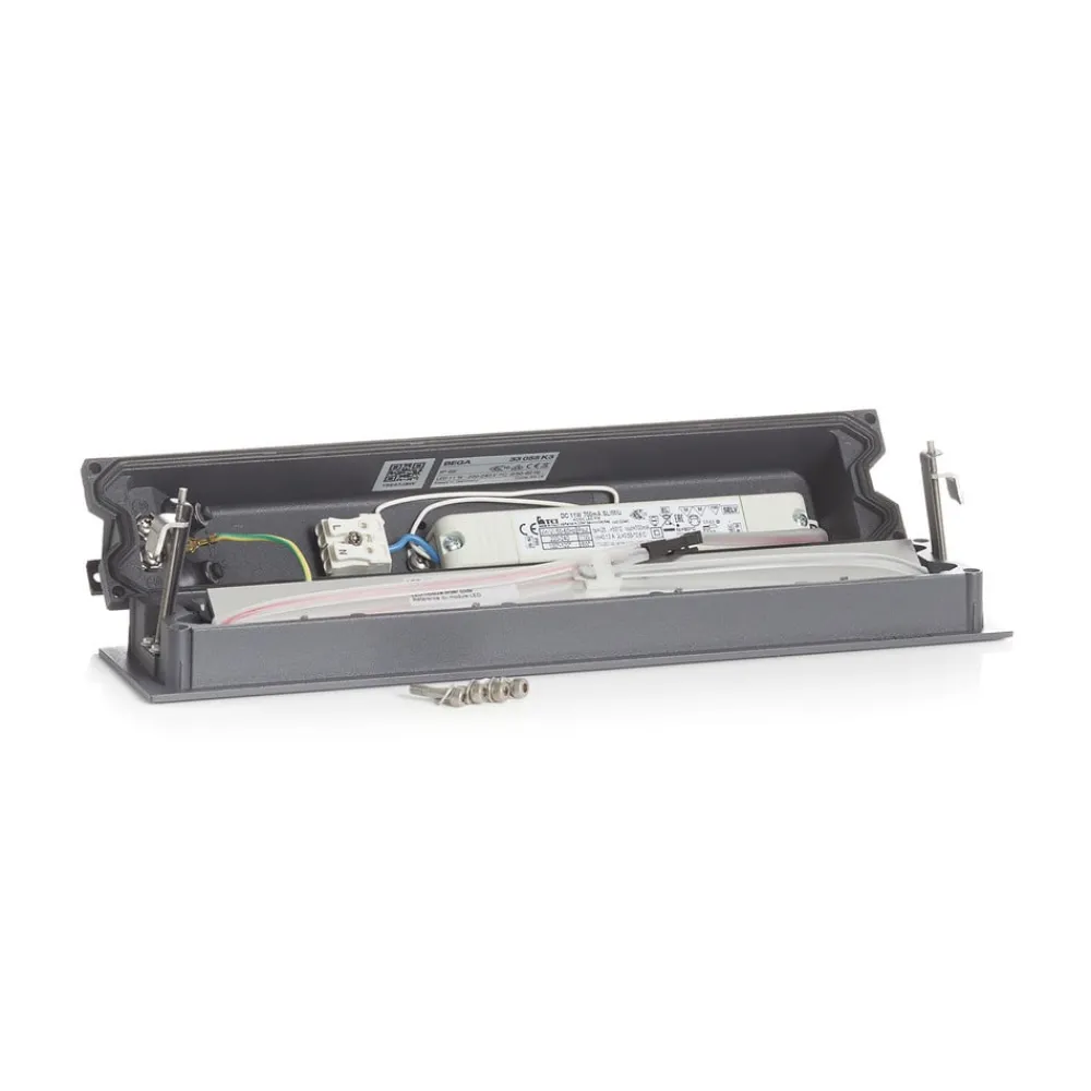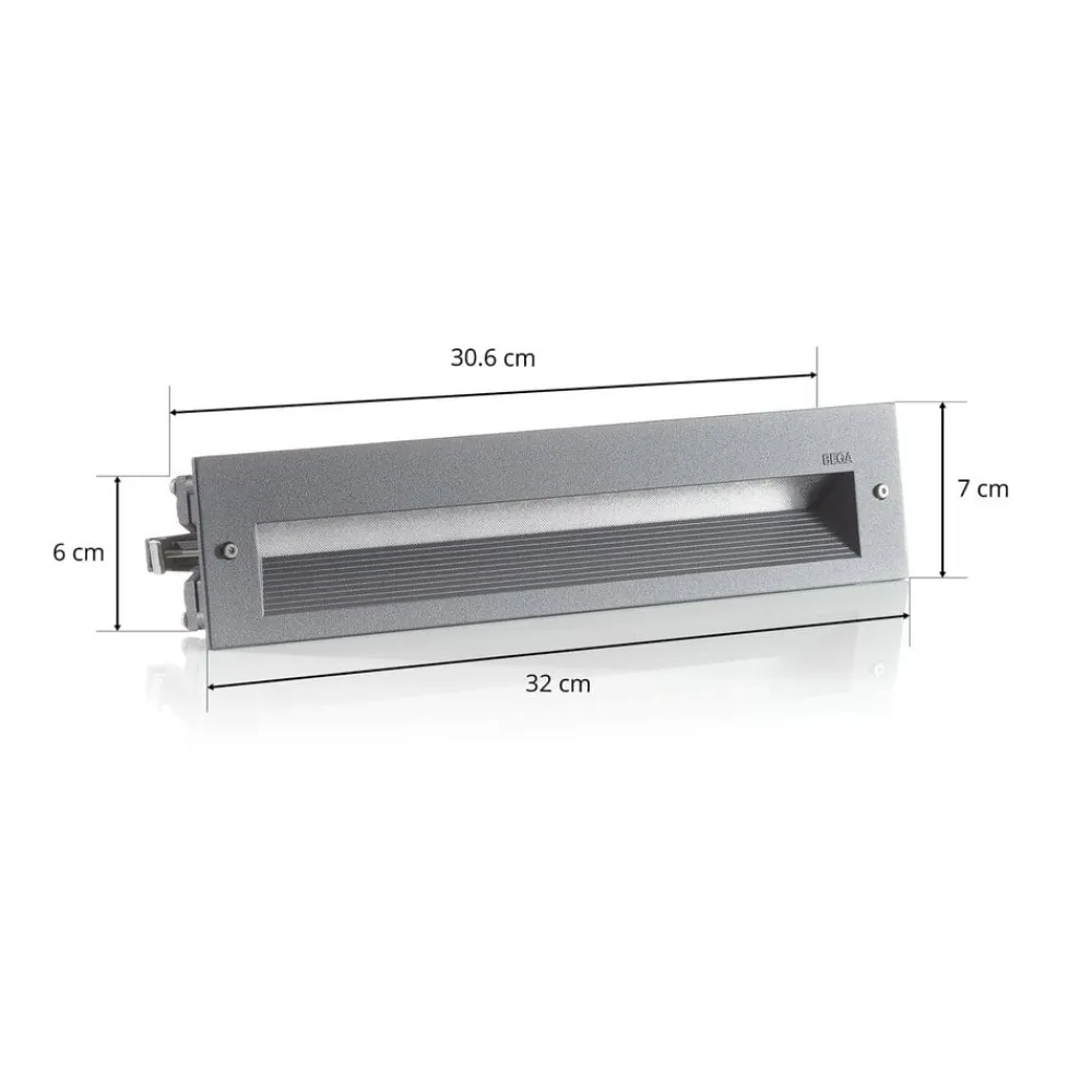 LED-vægindbygningslampe med asymmetrisk lysfordeling Denne LED-vægindbygningslampe er fremstillet af aluminium og rustfrit stål og har en diskret farve. Den monteres i væggen og flugter med facaden. På tværs af armaturets bredde er der et indhak, som er formet som en trekant indadtil og rummer de varmhvide LED’er i en lidt skjult position. Formen sikrer en asymmetrisk lysfordeling, så lysstrålen rettes præcis derhen, hvor der er brug for den. Det forhindrer også blænding, hvilket er særligt vigtigt i mørke. Det indbyggede armatur kan bruges udendørs på trapper, gangbroer, husfacader eller endda indgangspartier og er ideelt udstyret til dette takket være IP65-klassificeringen. Det er også velegnet til gennemfortrådning og sørger for sikker belysning om natten og pålidelig orientering, især i kombination med andre armaturer.
