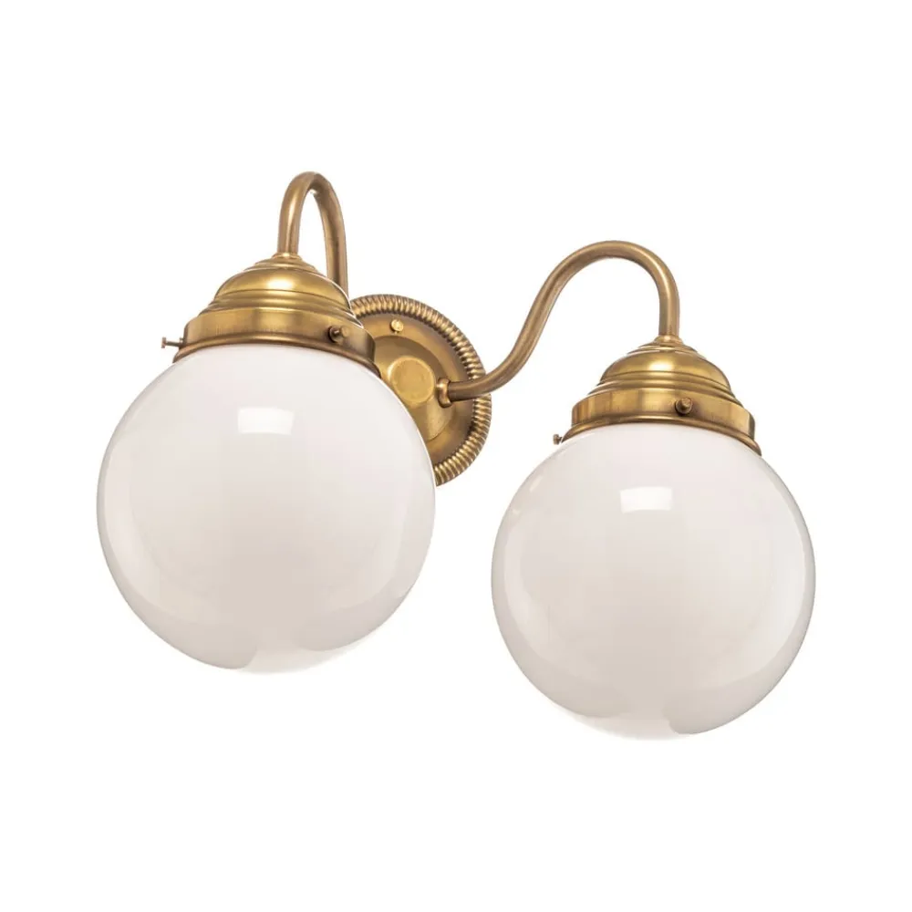 Elegant væglampe Larry II med klassiske elementer i berlinsk messing Model Larry II er en 2 lyskilder væglampe med klassisk, enkel elegance. Designet, der er lånt fra forrige århundredeskifte, imponerer med sit elegante udseende. De to glasskærme er mundblæste og giver en hyggelig belysning. Vægbeslaget er lavet af berlinsk messing, hvilket giver det et alderssvarende udseende og gør det nemt at rengøre med en tør klud.