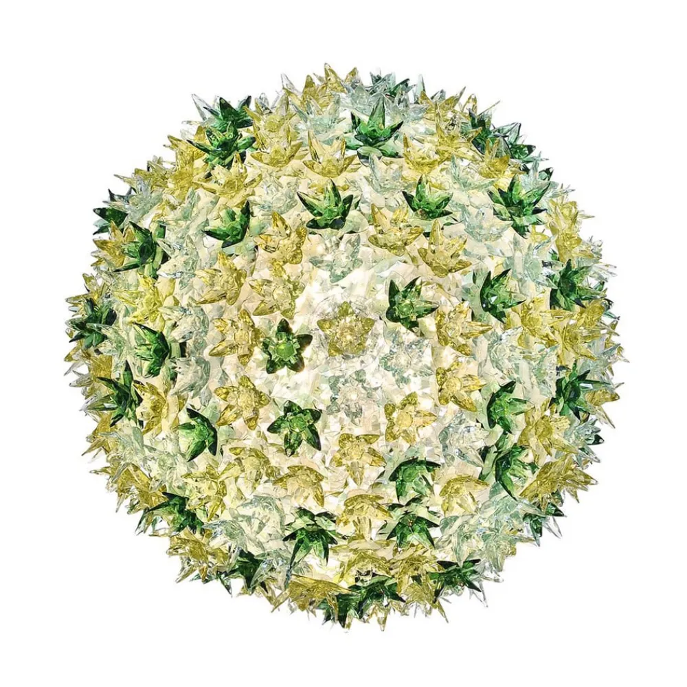 Den velkendte Bloom-serie af lamper fra den italienske designer Ferruccio Laviani er udvidet med endnu en model med denne loftslampe. De utallige små blomsterkranse på skærmen bryder lyset fra de små pærer inde i skærmen og reflekterer det ud i rummet på en helt særlig måde. Som følge heraf skinner blomsterne, som om de var besat med tusindvis af små krystaller.